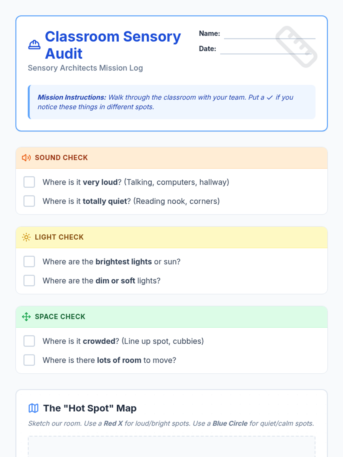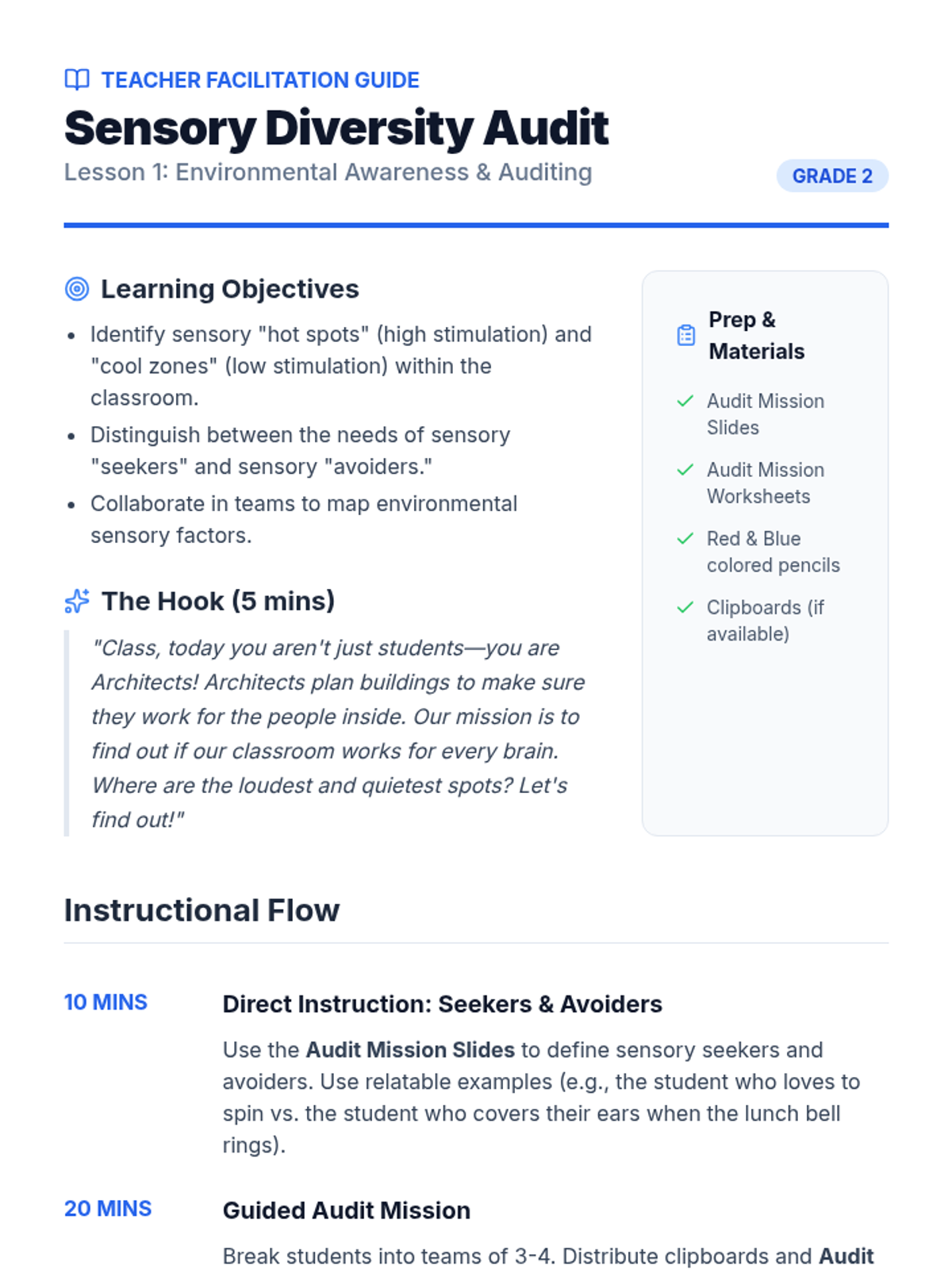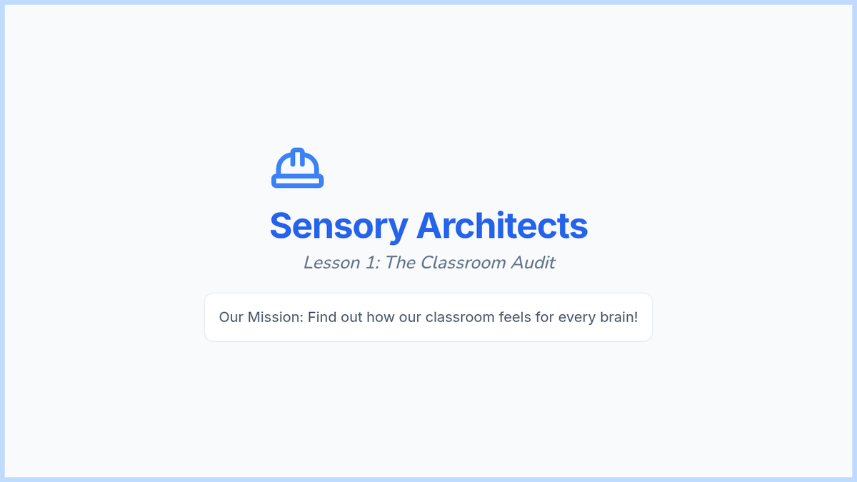 This project-based sequence teaches 2nd-grade students to identify sensory preferences, resolve sensory-based conflicts, and collaboratively design a more inclusive classroom environment. Through the lens of 'Sensory Architects,' students audit their space and advocate for the diverse needs of their community.