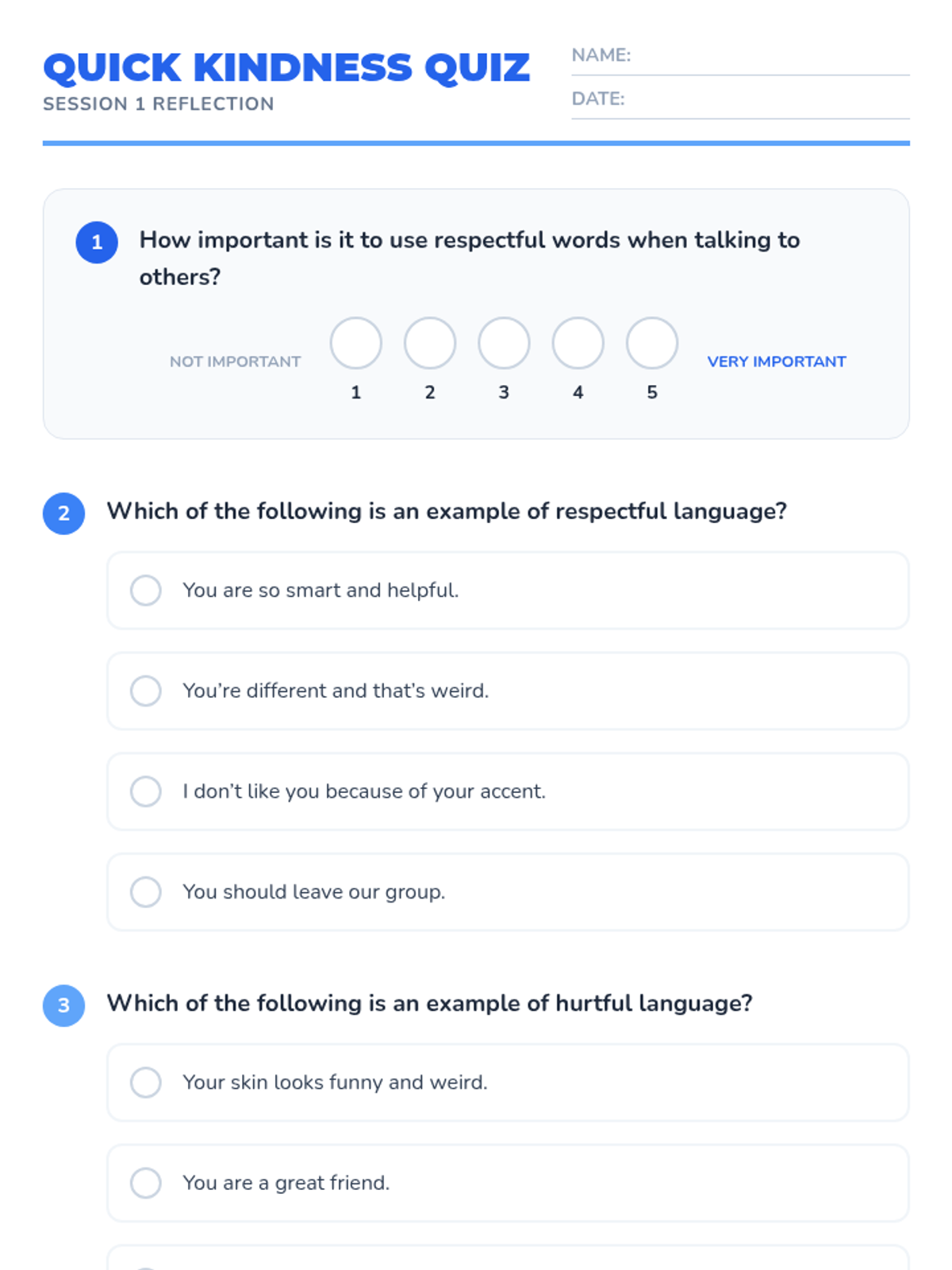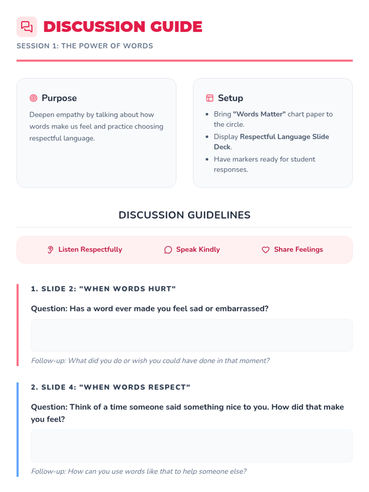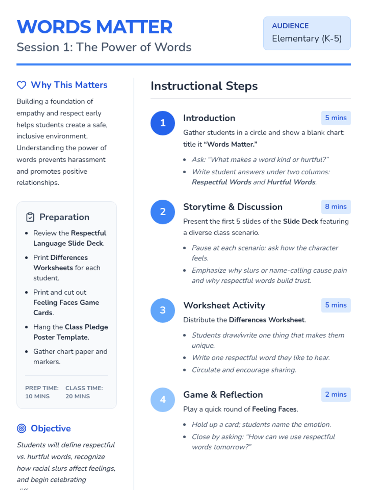 A 4-session Tier 1 sequence for K-5 students focused on racial slur prevention, respectful language, and celebrating diversity. Students learn empathy through role-play, sharing traditions, and creating a collective class pledge.