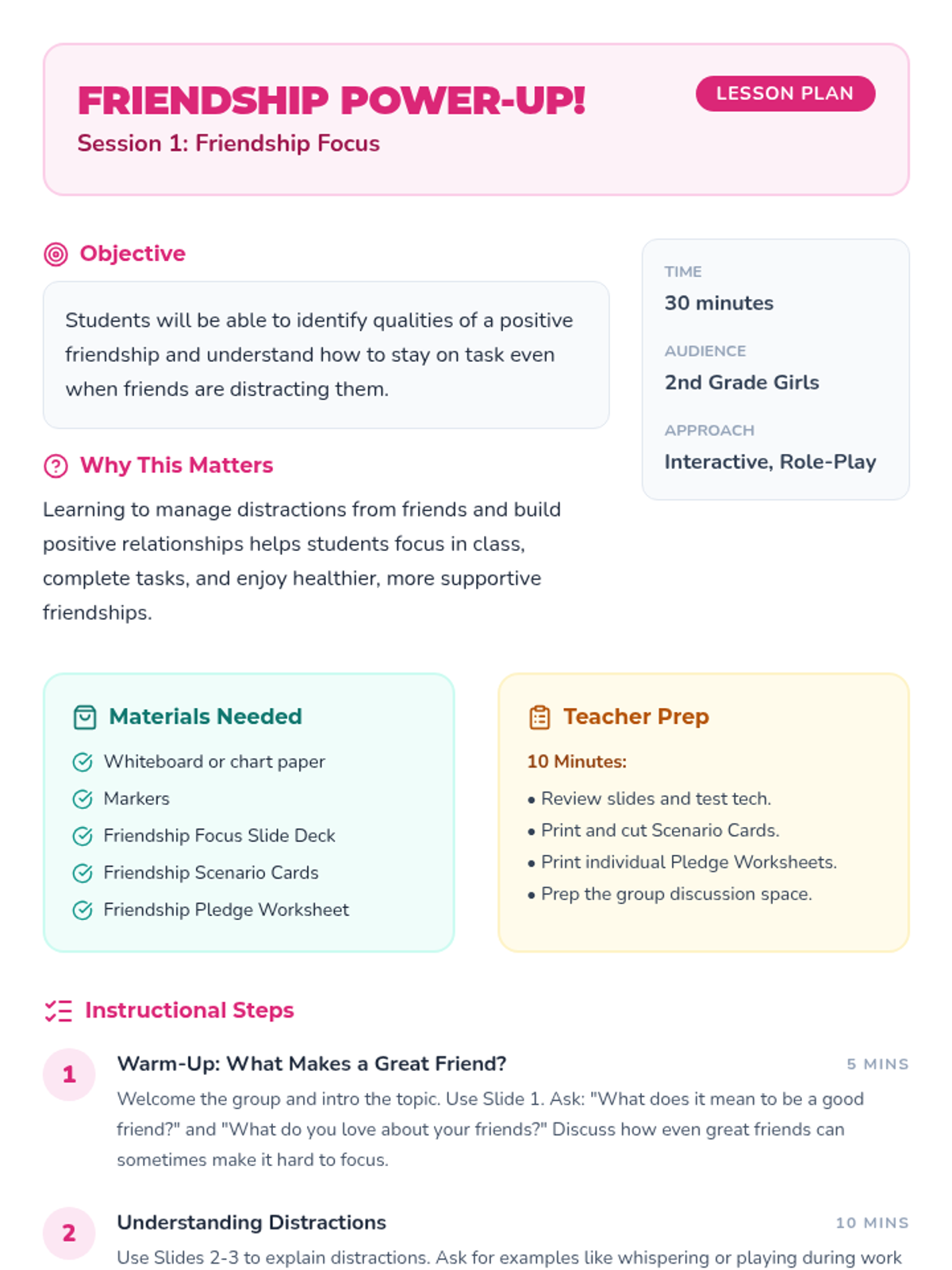 A two-session Tier 2 small group intervention for 2nd-grade girls focused on strengthening friendships through focus and resisting peer pressure.