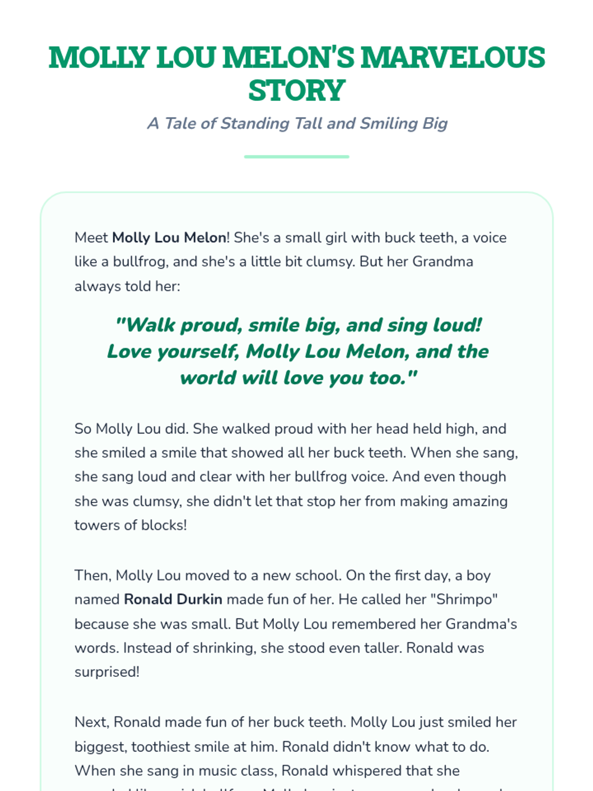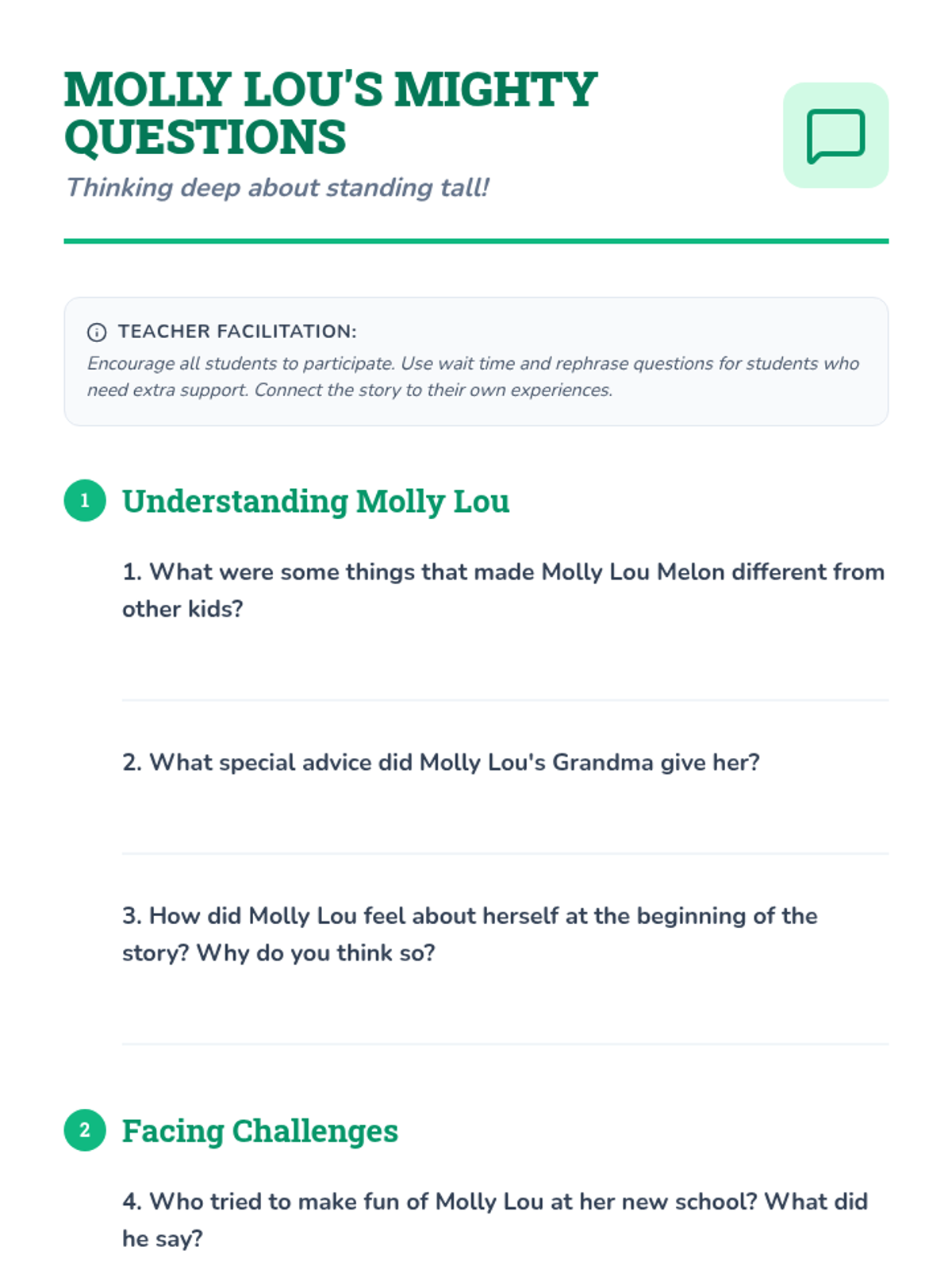 A series of two lessons for elementary students focused on building social-emotional skills through character study and developing reading comprehension through mystery-solving. Students explore self-esteem with Molly Lou Melon and practice identifying key details with the Case of the Missing Cookies.