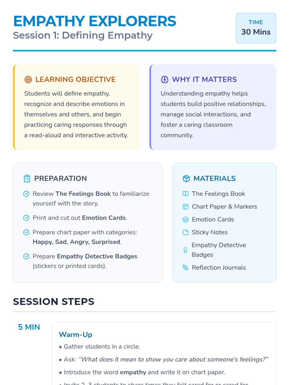A comprehensive 10-session social-emotional learning series for K-2 students, focusing on emotional literacy, regulation, empathy, and social problem-solving.