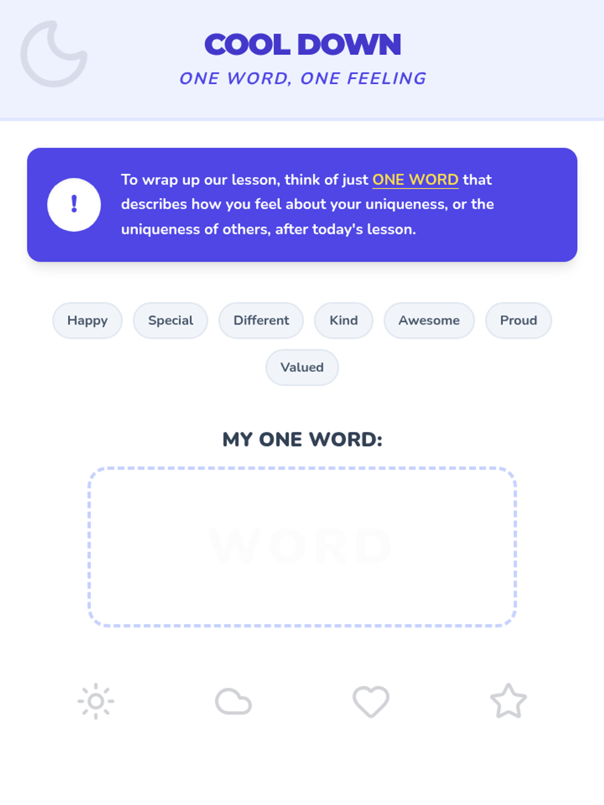 A therapeutic and self-discovery sequence for 2nd graders to identify personal sources of joy. Students explore the physical sensations of happiness, categorize their interests, and create a personalized 'Joy Menu' to use as a coping strategy for emotional regulation.