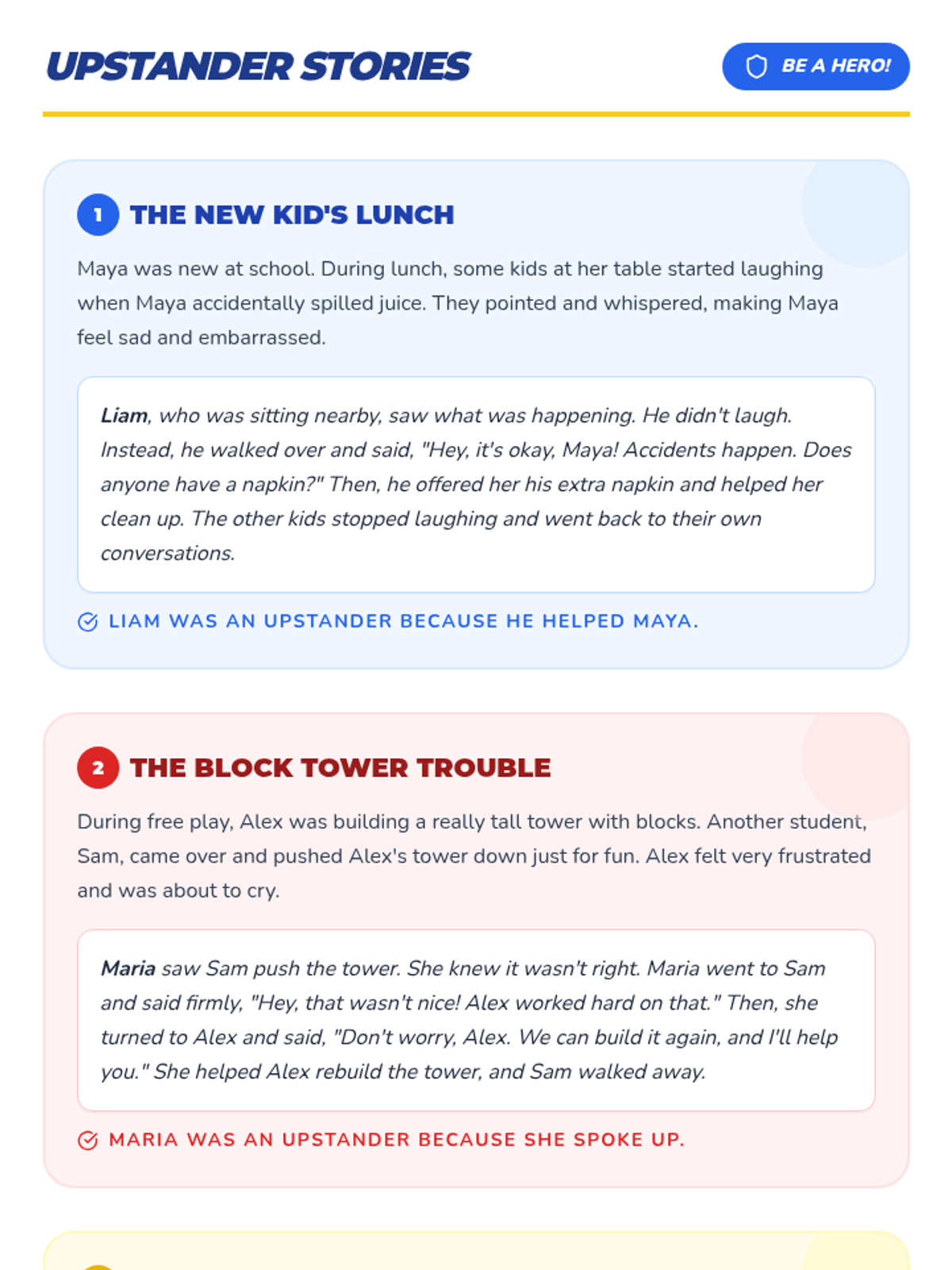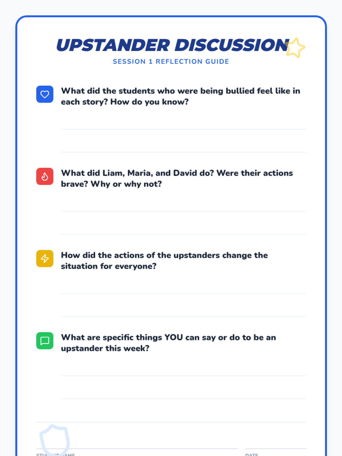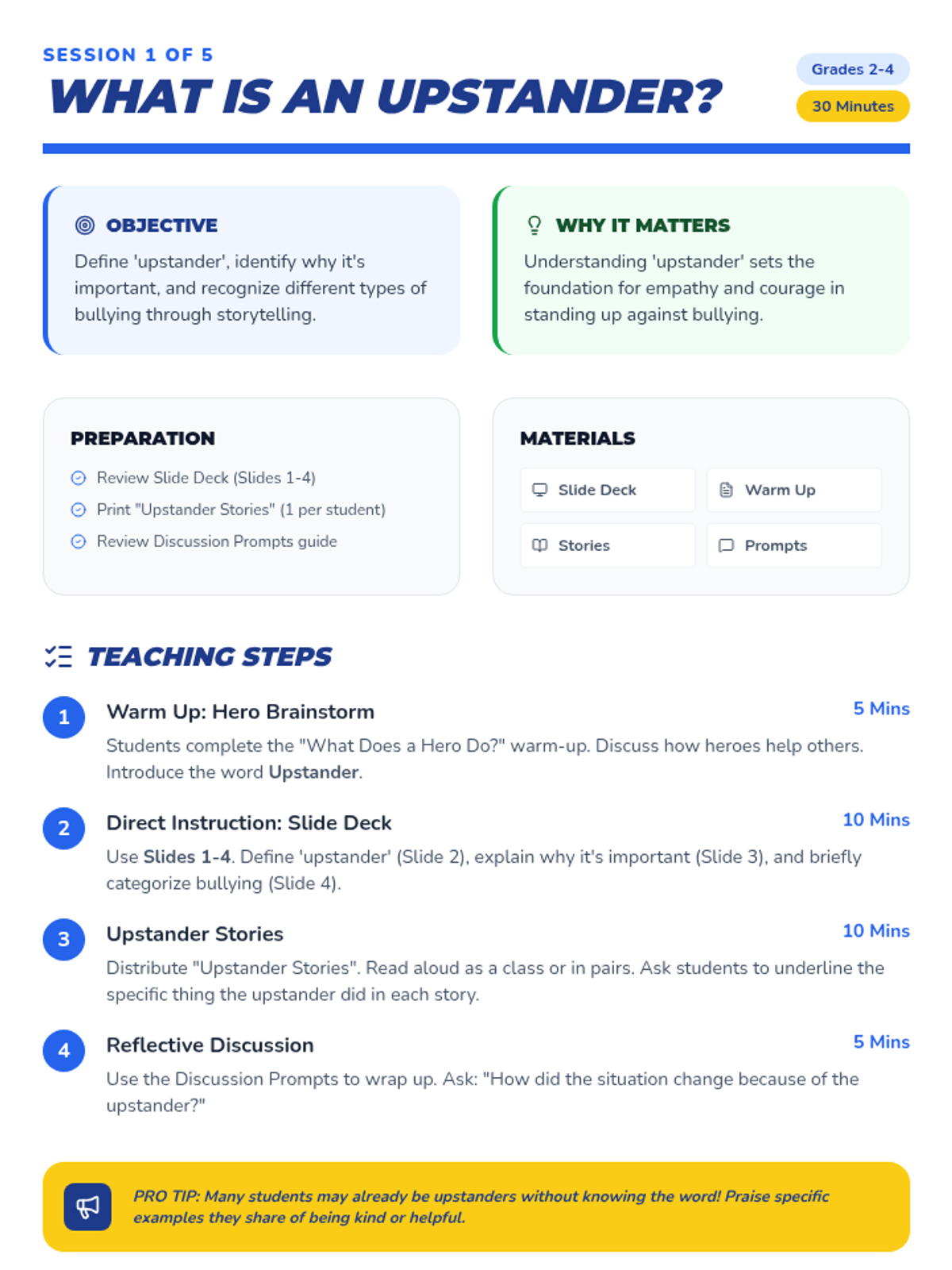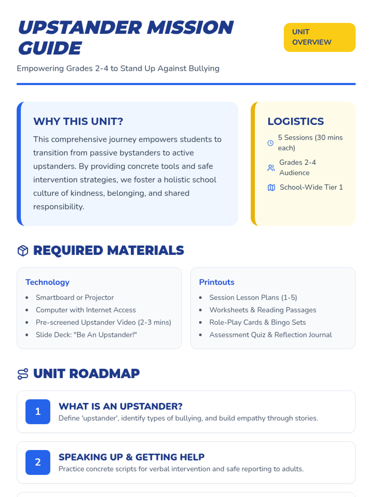 A five-session unit for grades 2-4 focused on empowering students to recognize bullying and act as upstanders using safe and effective strategies.