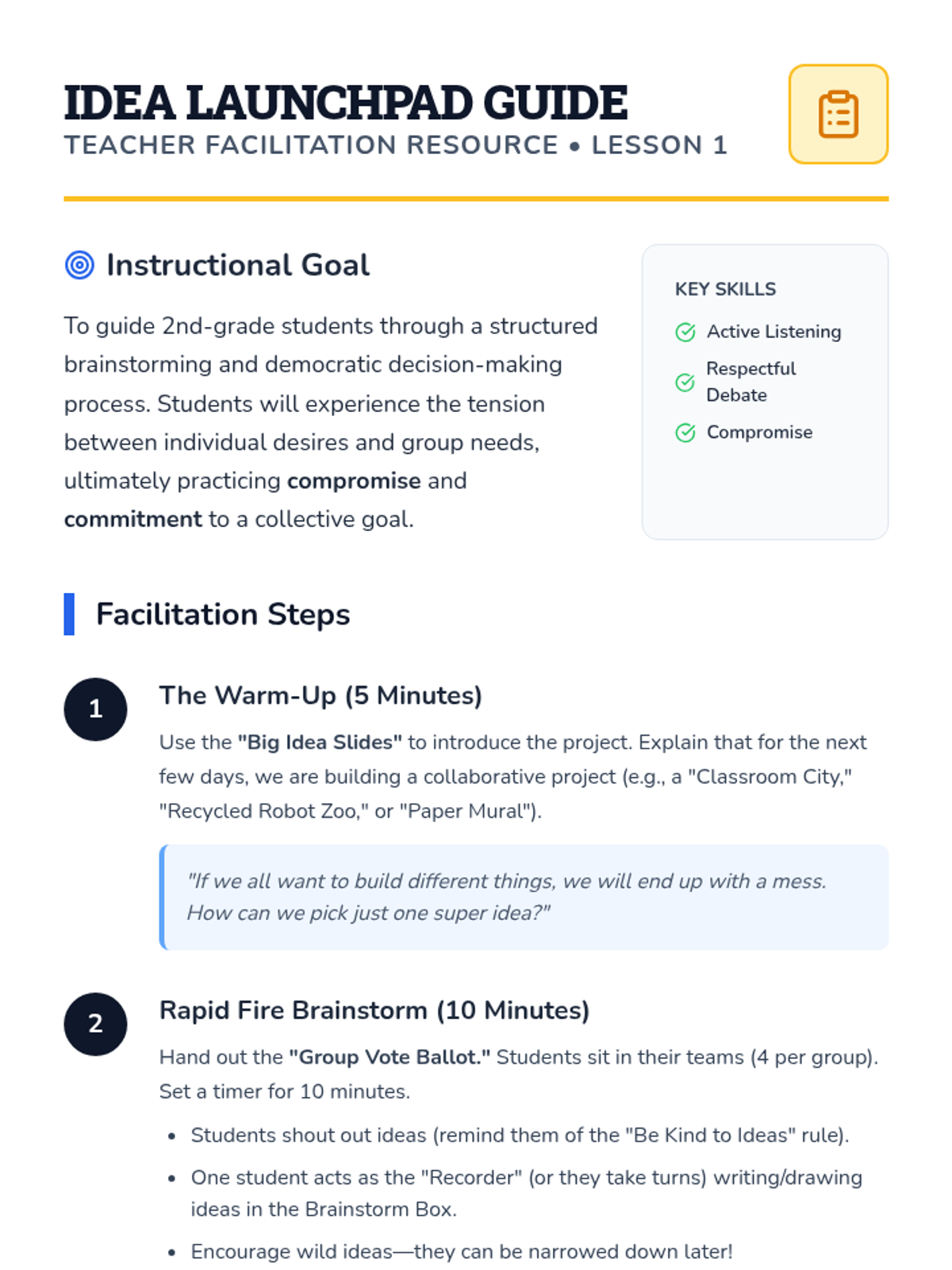 This sequence teaches 2nd-grade students how to manage conflict through active listening and collaborative negotiation. Students learn to de-escalate their emotions, listen with intent, brainstorm 'win-win' solutions, and use fair decision-making tools to resolve disputes independently.
