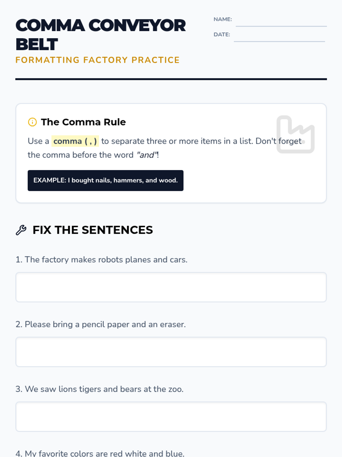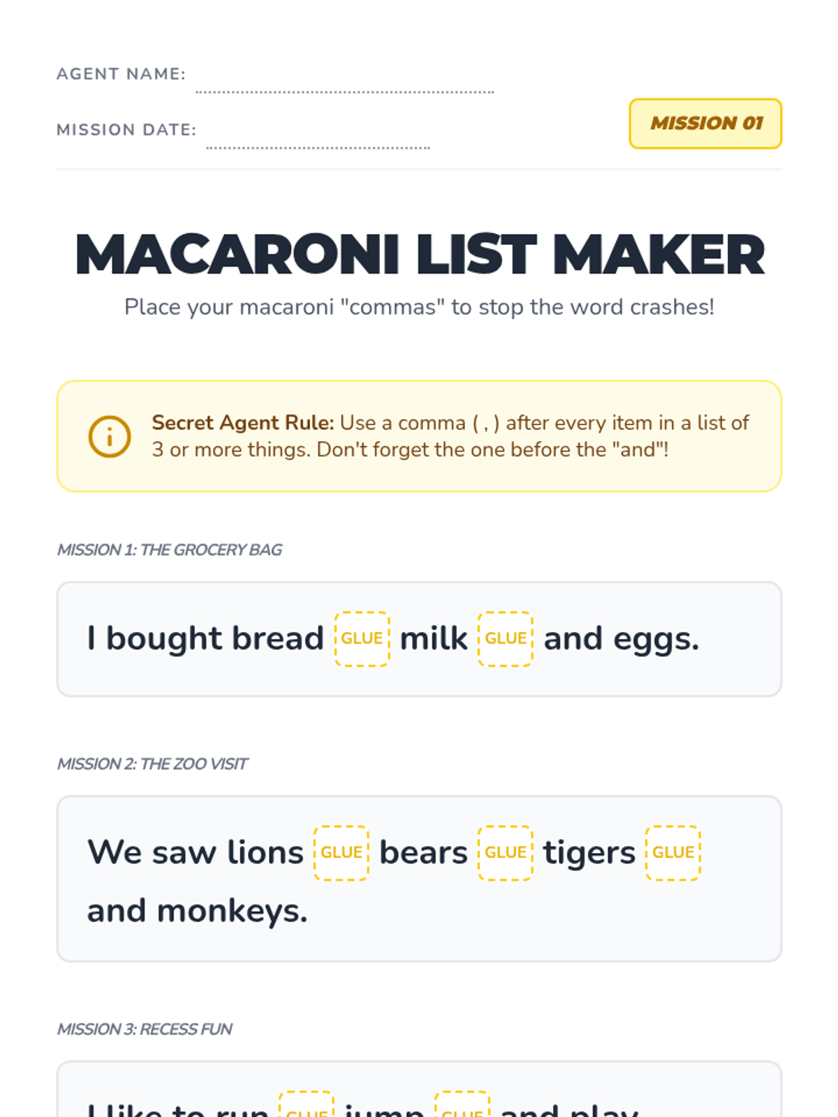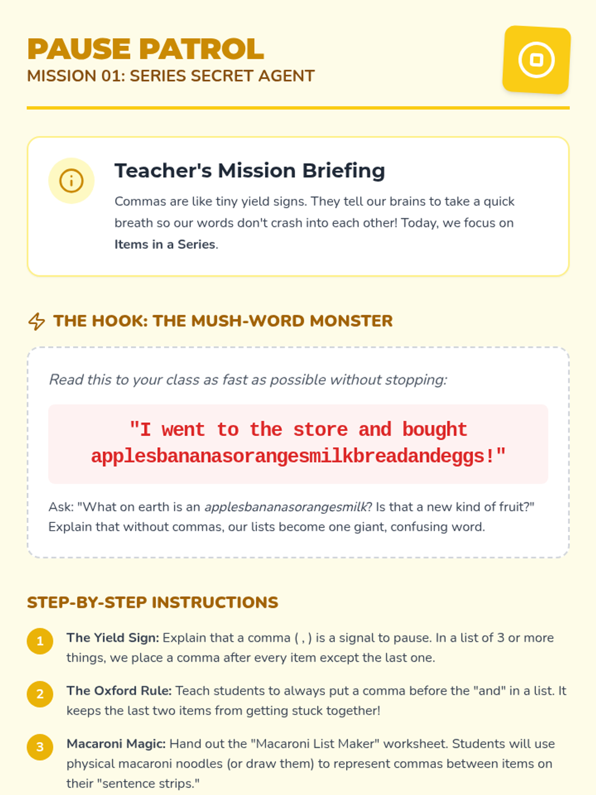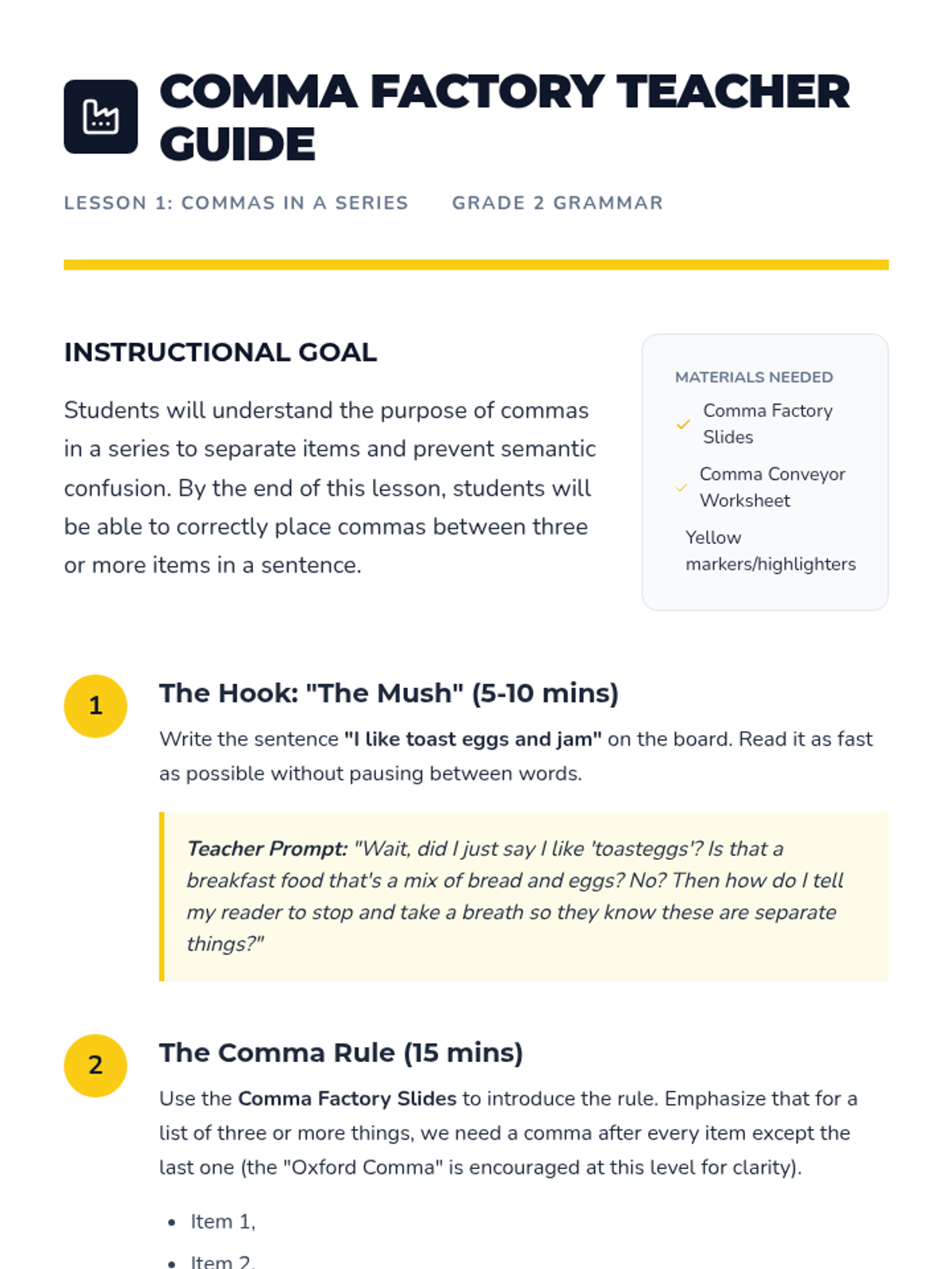 A 2nd-grade grammar workshop focused on the practical application of commas in lists, dates, and friendly letters. Students learn that commas act as 'yield signs' or pauses for the reader through hands-on activities, games, and writing projects.