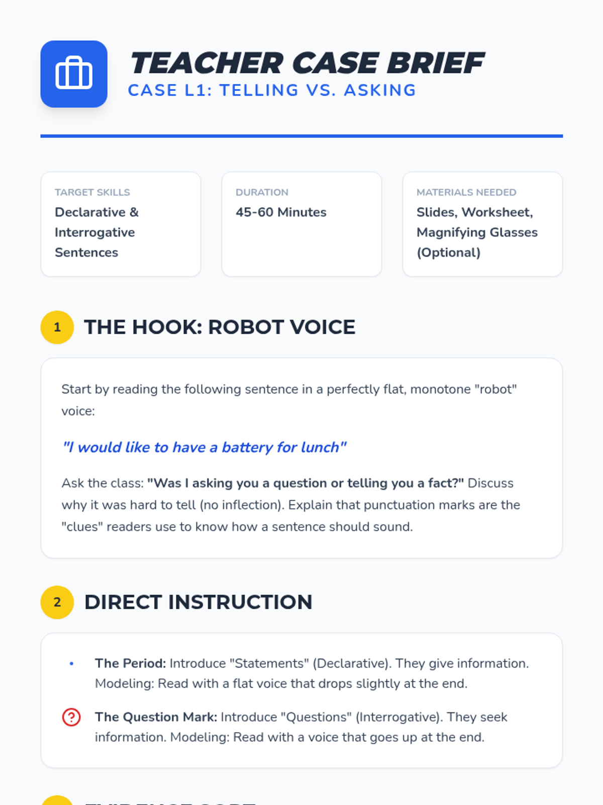 This sequence introduces 2nd-grade students to grammatical mood through the functions of statements, questions, and commands. Students use a 'News Bureau' theme to explore how verb forms change based on whether they are reporting facts, asking for info, or giving orders.