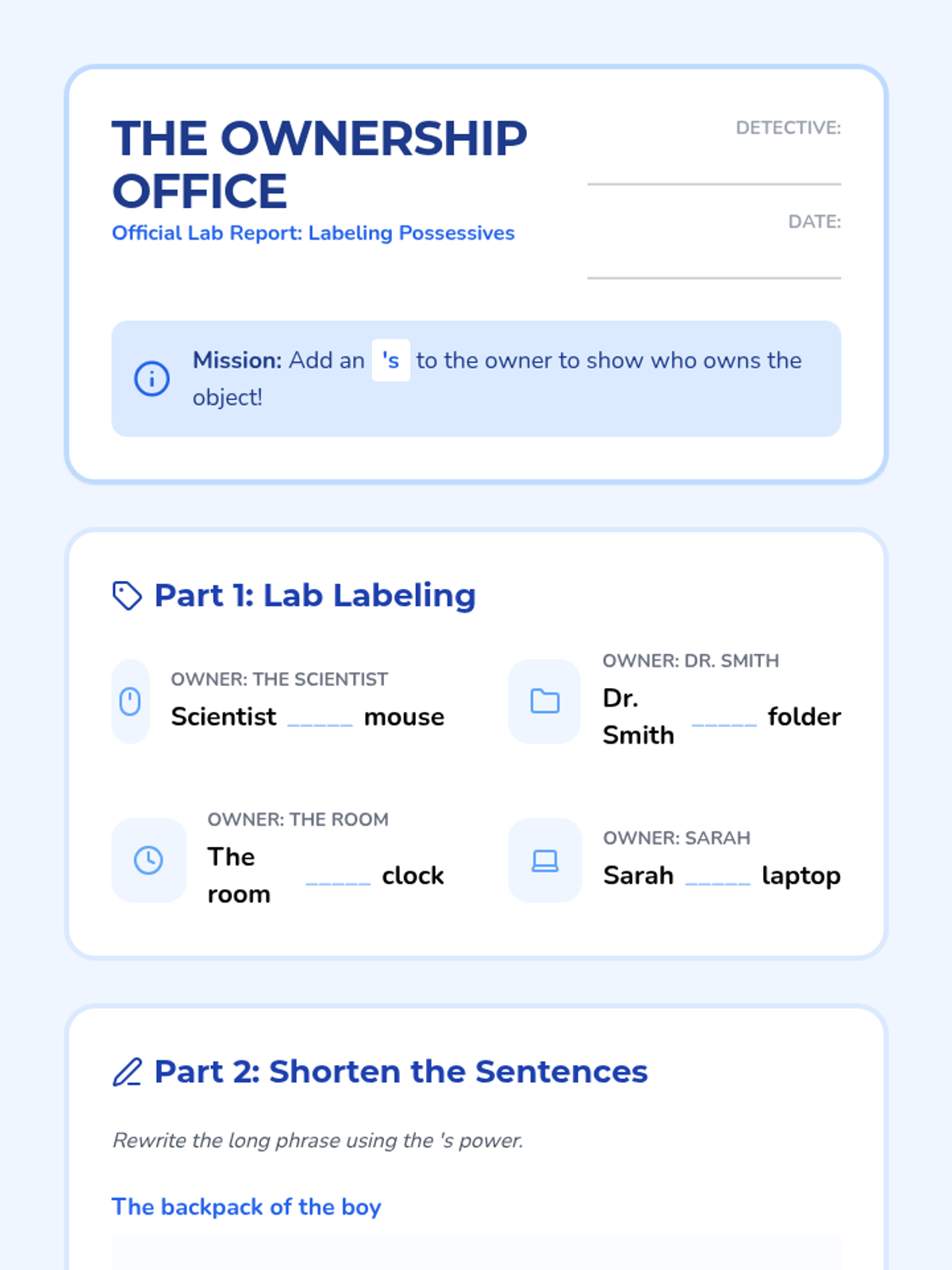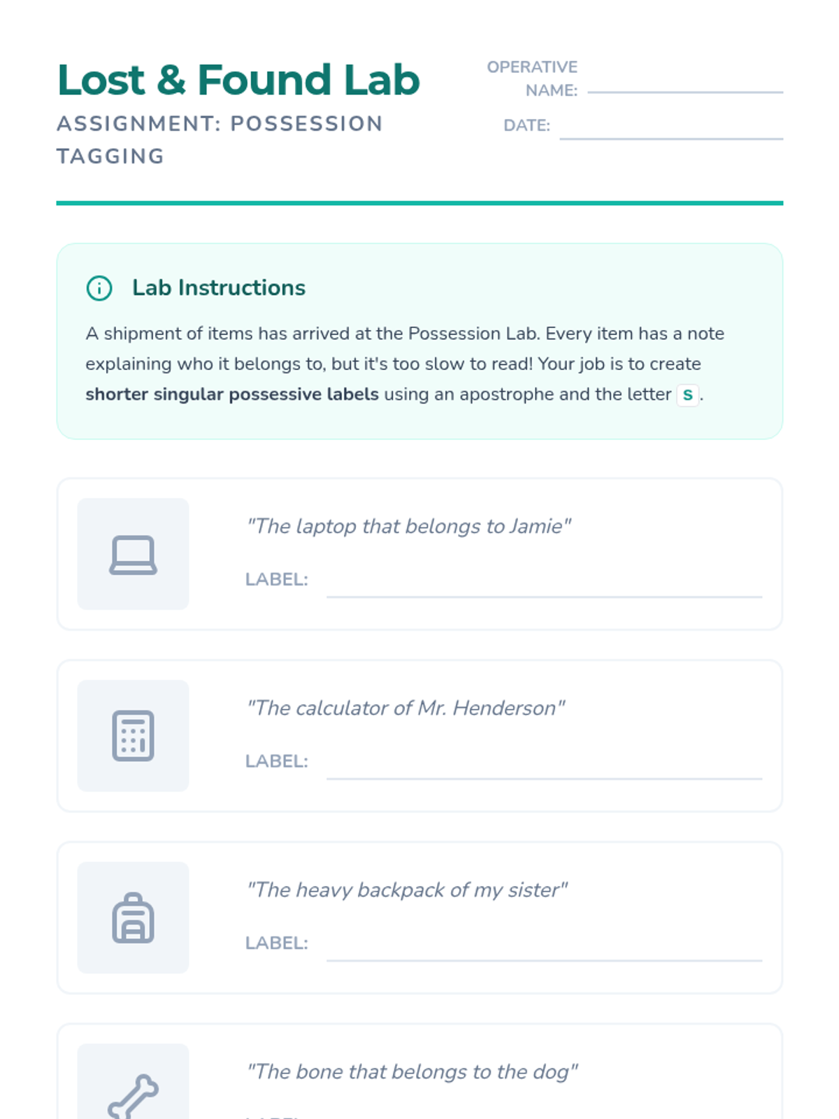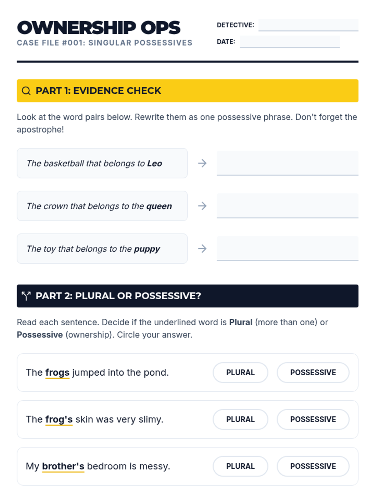 An inquiry-based exploration of apostrophes, covering singular and plural possessives, contractions, and tricky homophones through the lens of 'word surgery' and 'punctuation investigations.'