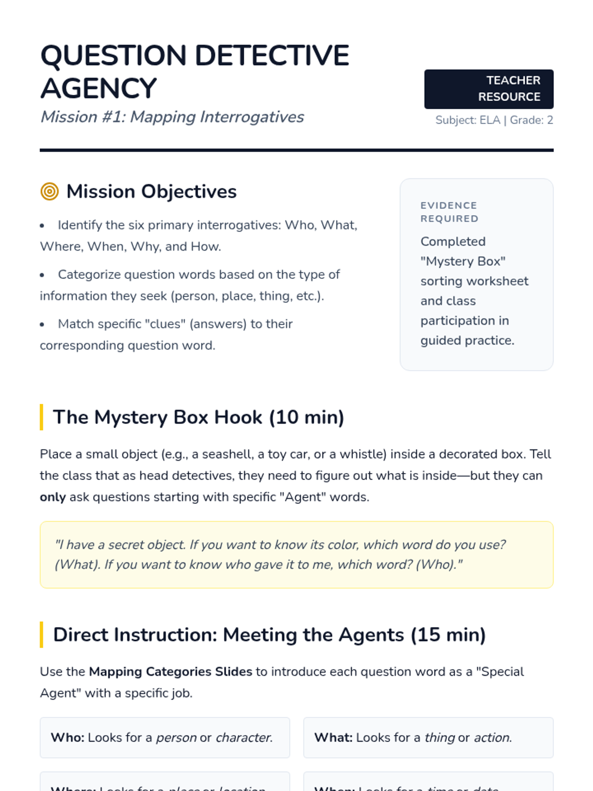 A mystery-themed ELA sequence for 2nd graders that teaches the use of interrogatives (Who, What, Where, When, Why, How) through a simulated investigation of a missing classroom mascot. Students act as detectives, using specific question words to gather evidence, identify suspects, and solve the case.
