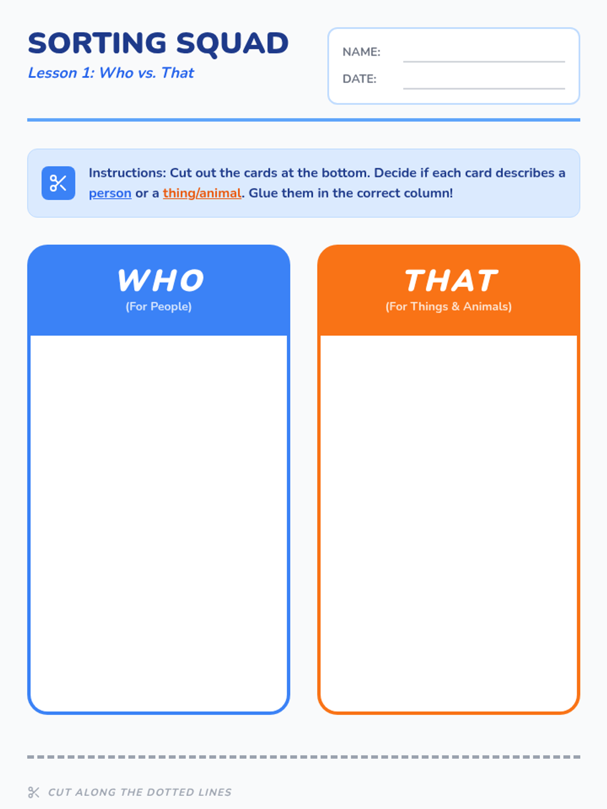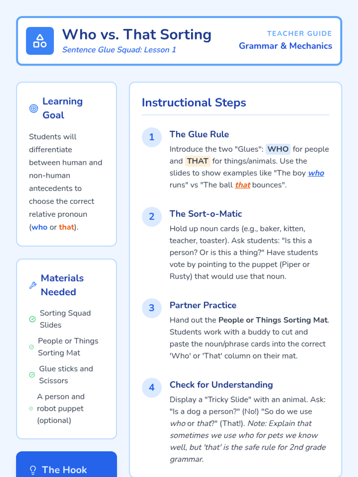A 2nd-grade grammar sequence focusing on using relative pronouns (who and that) to combine simple sentences into descriptive ones. Through a 'Sentence Glue' theme, students learn to differentiate between human and non-human antecedents and improve their writing fluency.