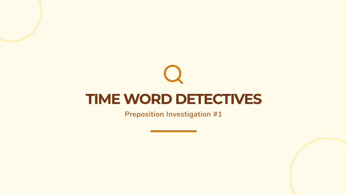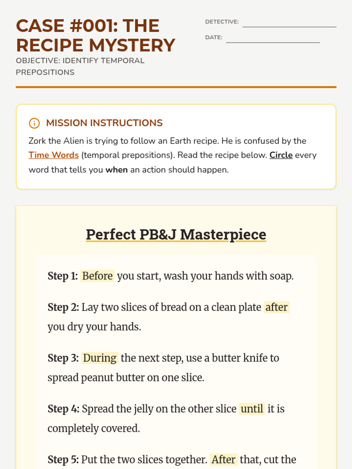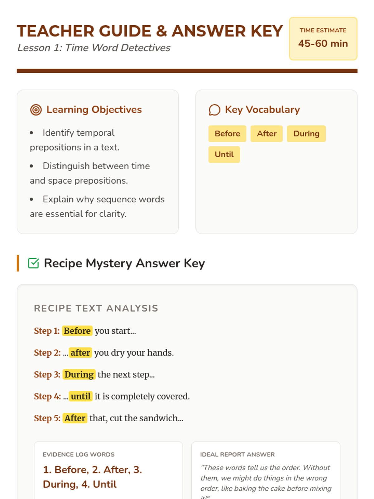 A 5-lesson series for 2nd graders focusing on temporal prepositions (before, after, during, until) and their role in sequencing events, narrative structure, and procedural writing. Students transition from identifying time words in recipes to creating timelines and writing their own 'how-to' guides.