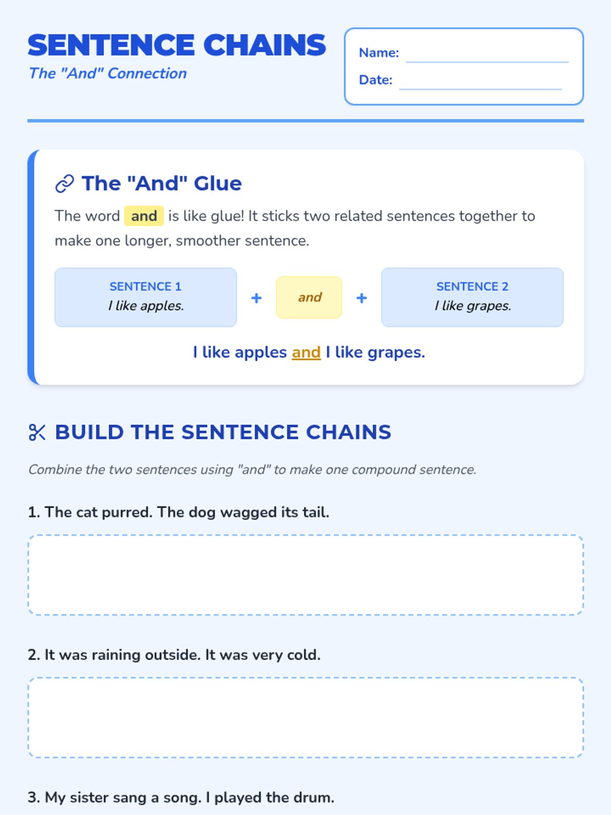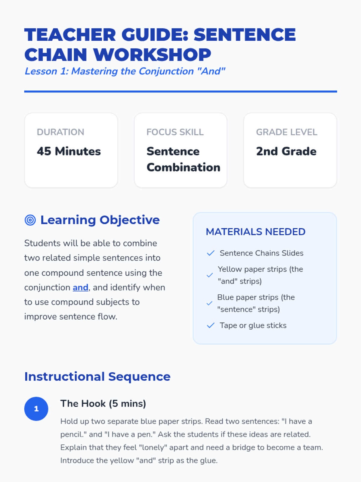 A 5-lesson sequence for 2nd graders to master conjunctions (and, but, or, so, because). Students progress from simple sentence combinations to revising paragraphs for better flow and complexity.