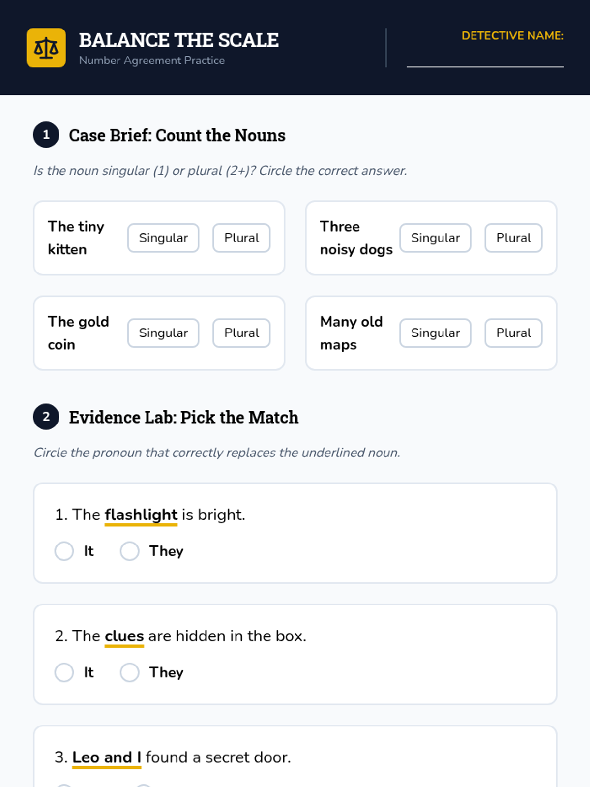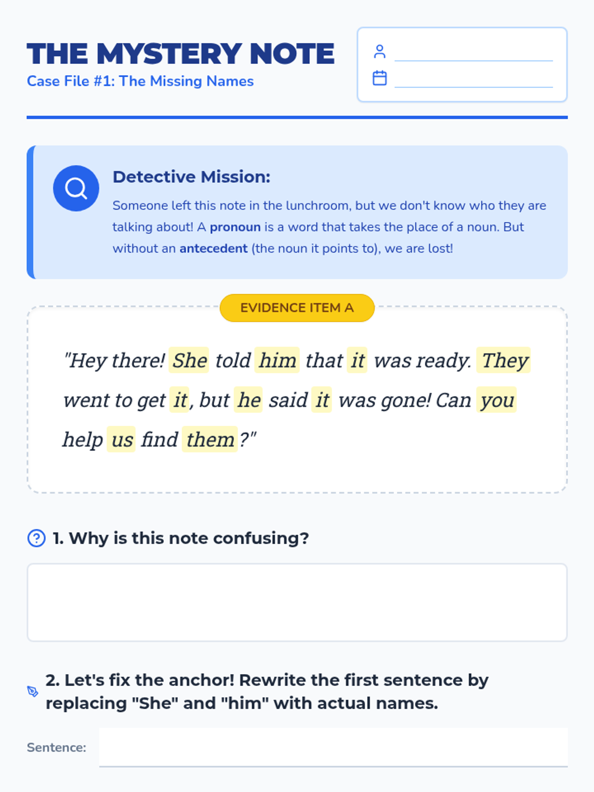 A detective-themed sequence for 2nd graders to master pronoun-antecedent agreement. Students learn to match number and gender, identify missing antecedents, and ensure clarity in writing through proofreading.