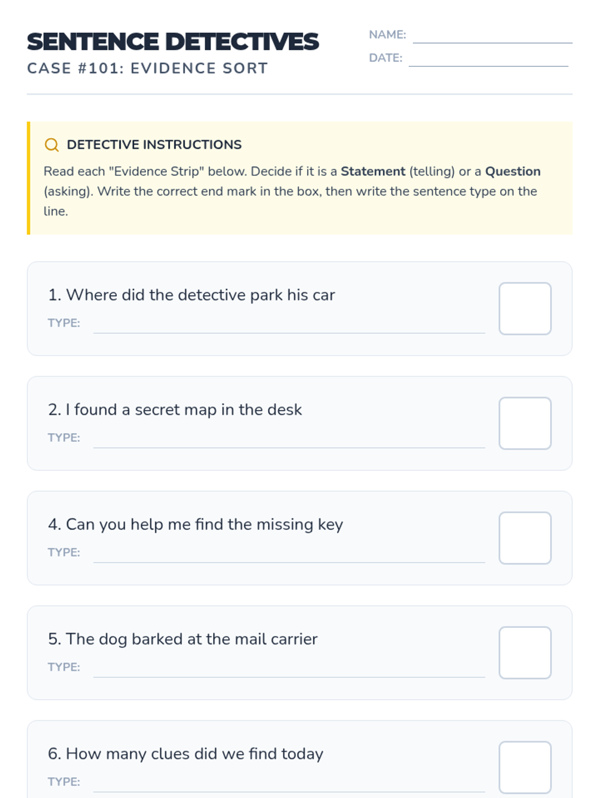 Students become 'Sentence Detectives' to master the four types of sentences and their end punctuation. They explore statements, questions, commands, and exclamations through interactive activities, editing challenges, and creative comic design.