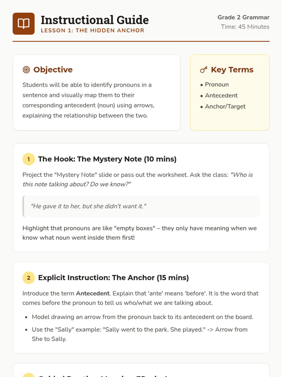 A 2nd-grade grammar sequence focusing on pronoun-antecedent agreement. Students become 'Pronoun Detectives' to solve mysteries of unclear writing by matching pronouns to their correct antecedents in number and gender.