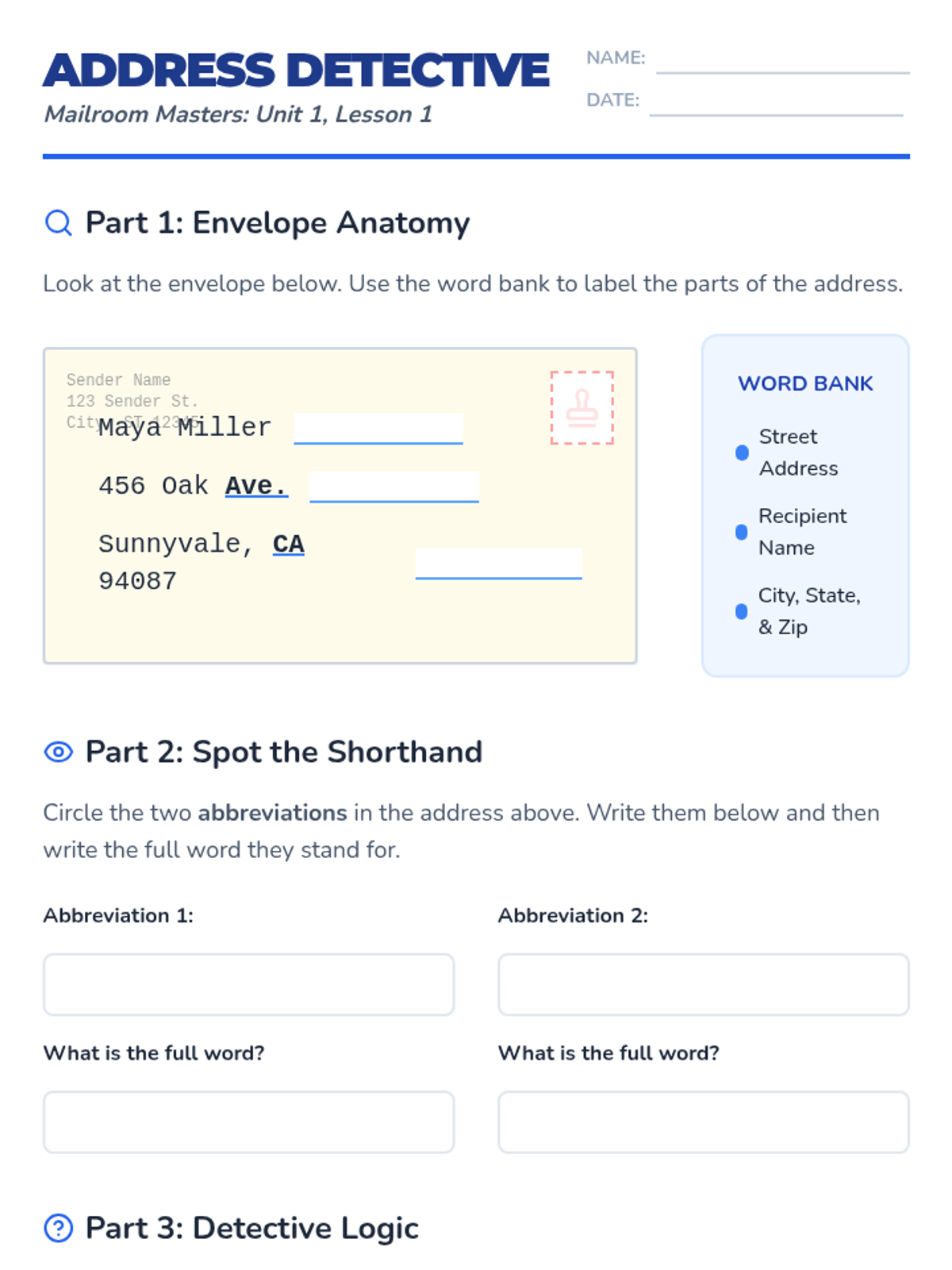 A 2nd-grade grammar sequence focusing on abbreviations in the context of writing and addressing mail. Students learn titles, street names, and state codes through a project-based simulation of a classroom post office.