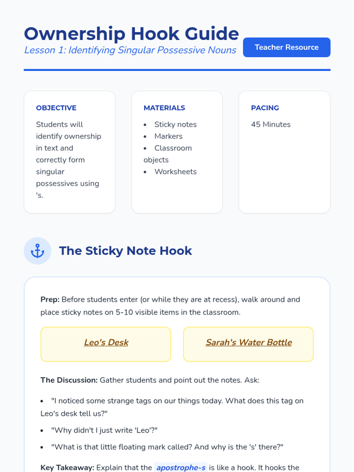 A comprehensive 5-lesson sequence where students act as "word surgeons" and "grammar detectives" to master the distinct roles of the apostrophe in possessive nouns and contractions.