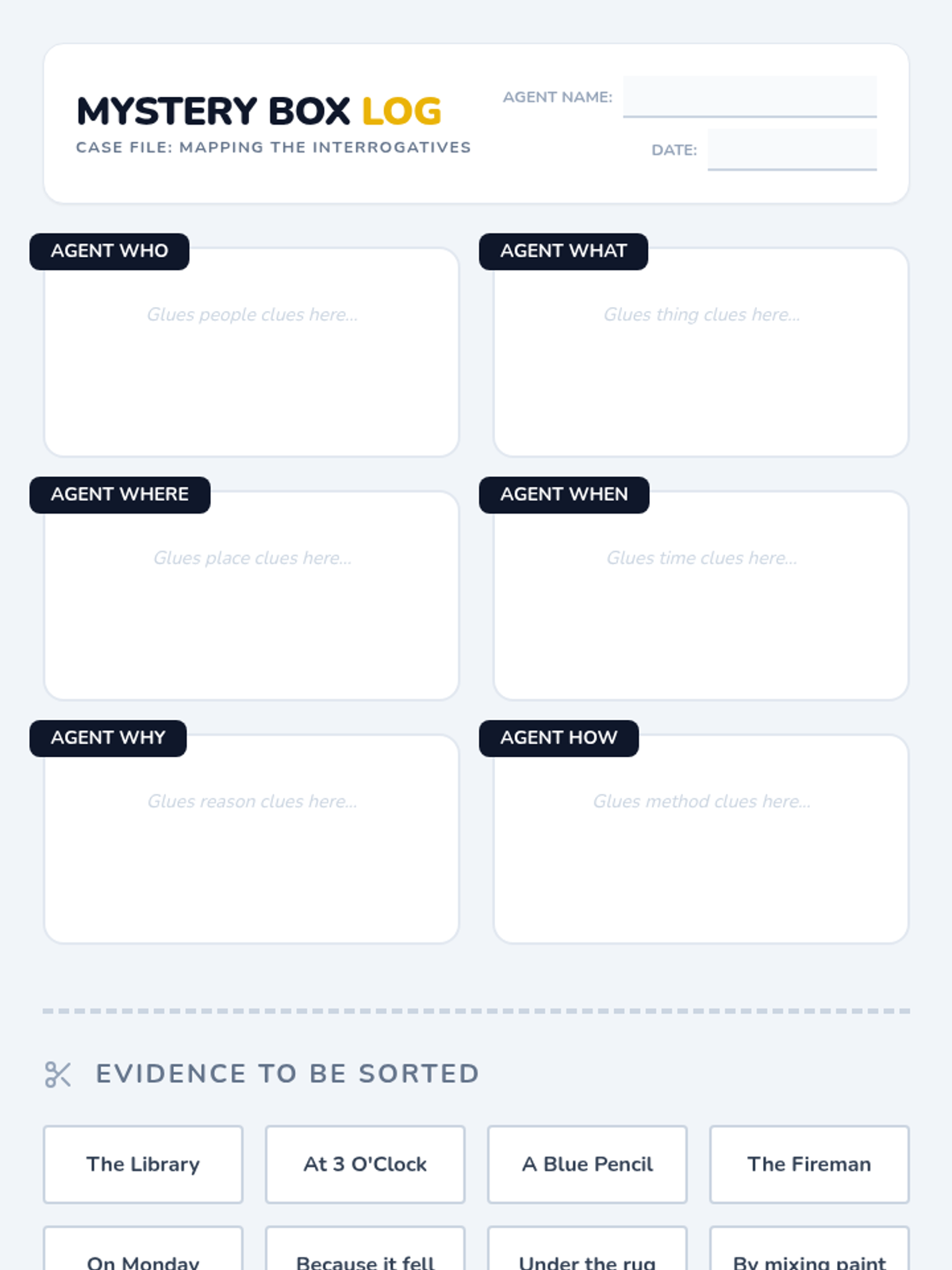 A comprehensive 2nd Grade ELA sequence exploring the six primary question words (who, what, where, when, why, and how). Through a detective-themed series of lessons, students learn to categorize interrogatives, differentiate between abstract concepts like time and process, and master the link between specific question words and the information they elicit.
