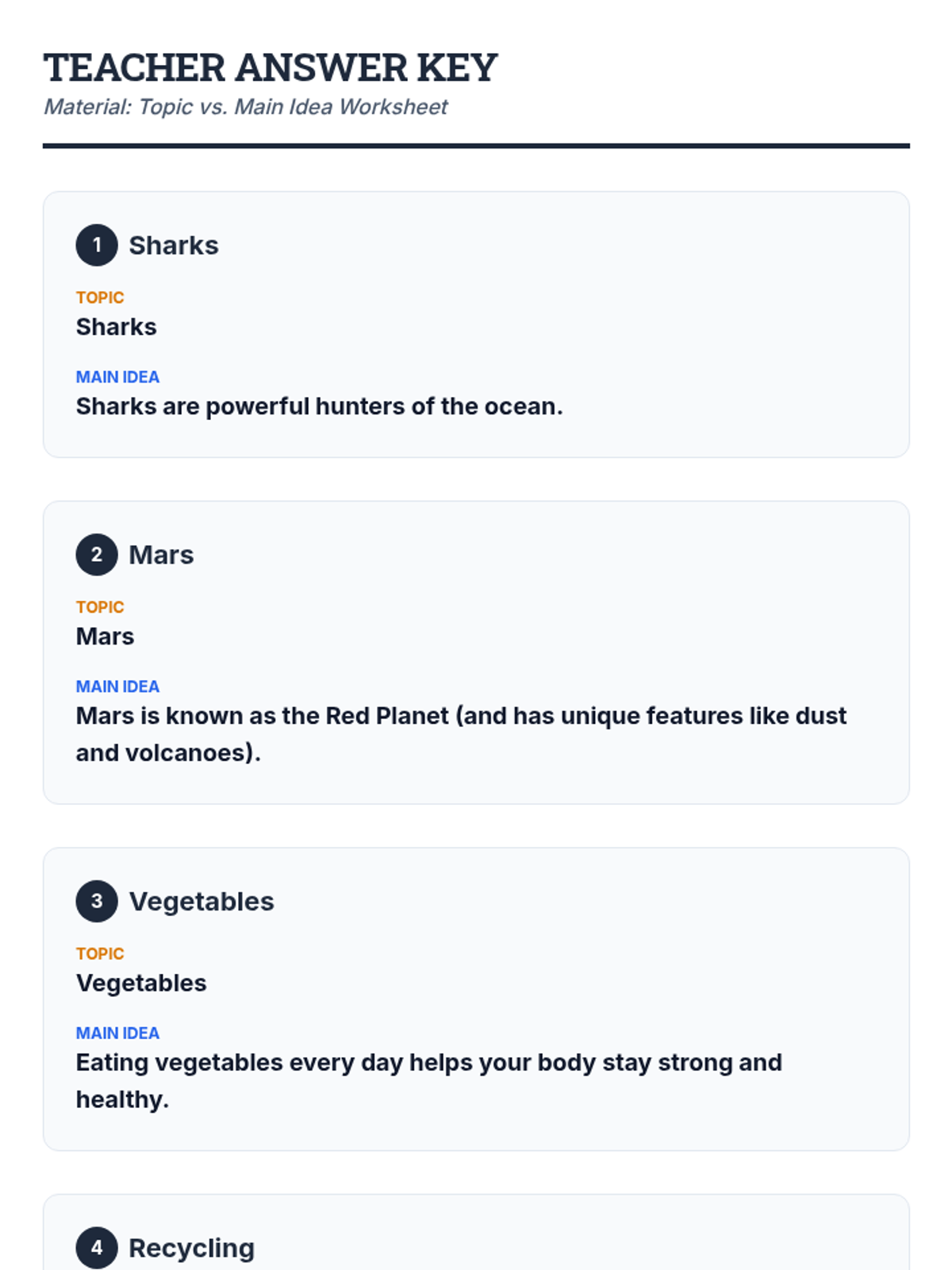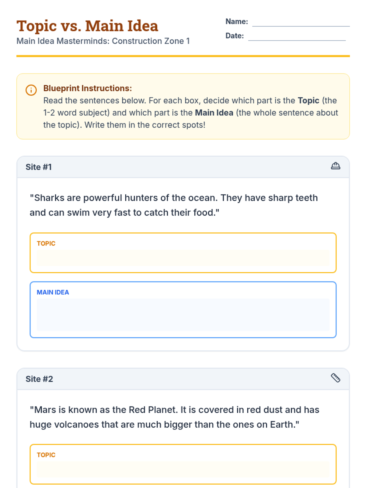 Main IdeaIdentification of central messages and supporting details within informational and narrative texts. Strengthens summarization skills and the ability to distinguish primary points from secondary evidence.