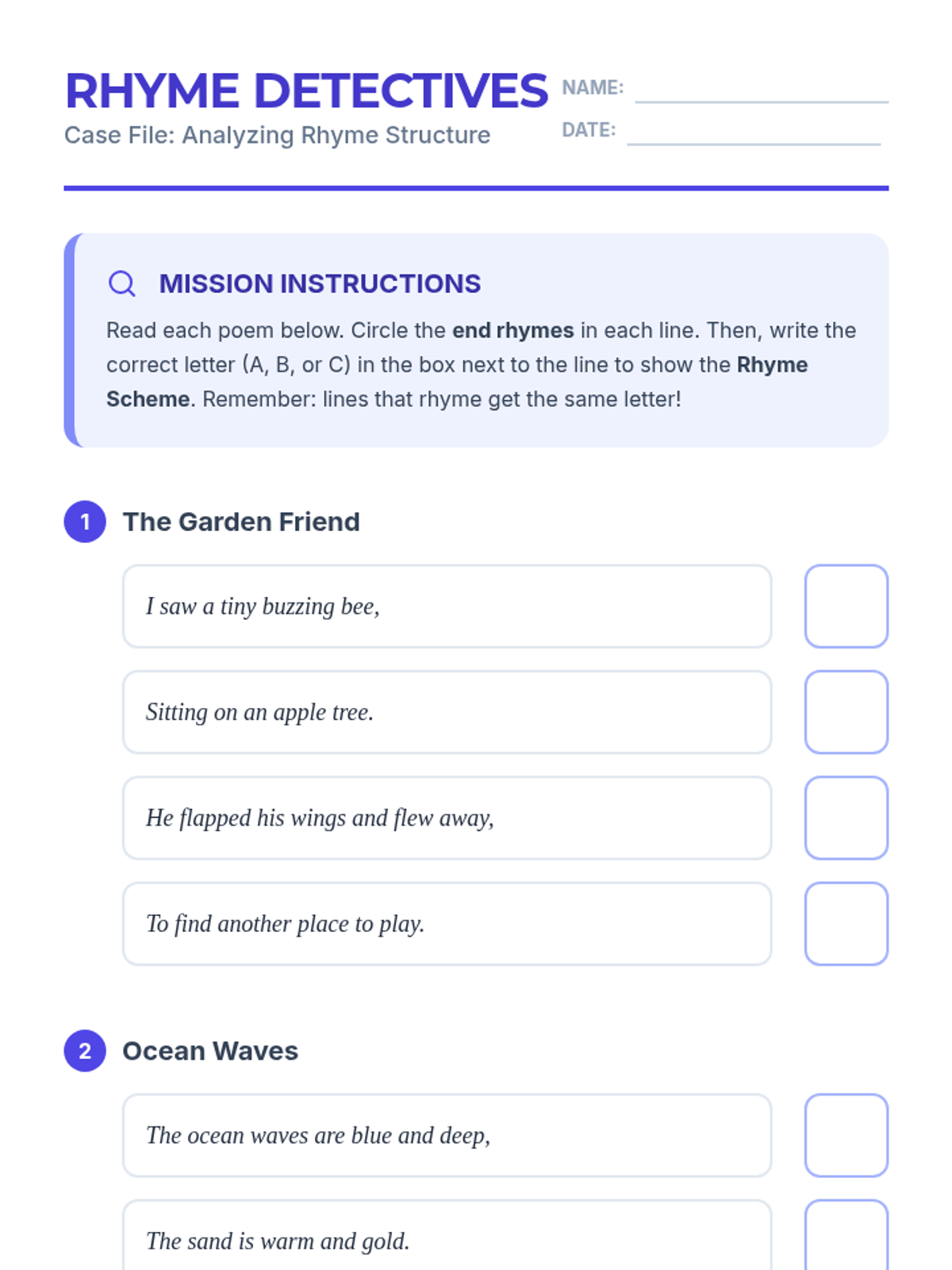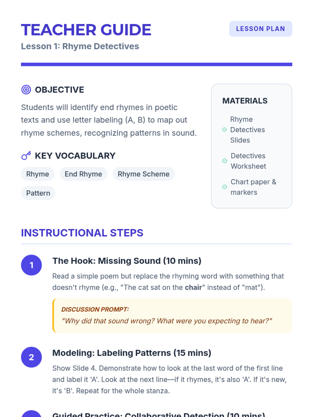 A 2nd-grade ELA sequence focused on rhythm, rhyme, and mood in poetry through read-along experiences. Students explore how the musicality of language enhances meaning and practice recitation.