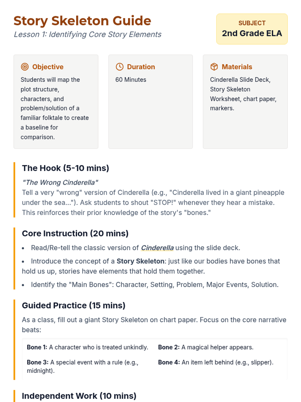 Story ElementsIdentification and analysis of plot, characters, setting, conflict, and resolution. Strengthens reading comprehension by mapping narrative structures and examining how individual components shape a story.