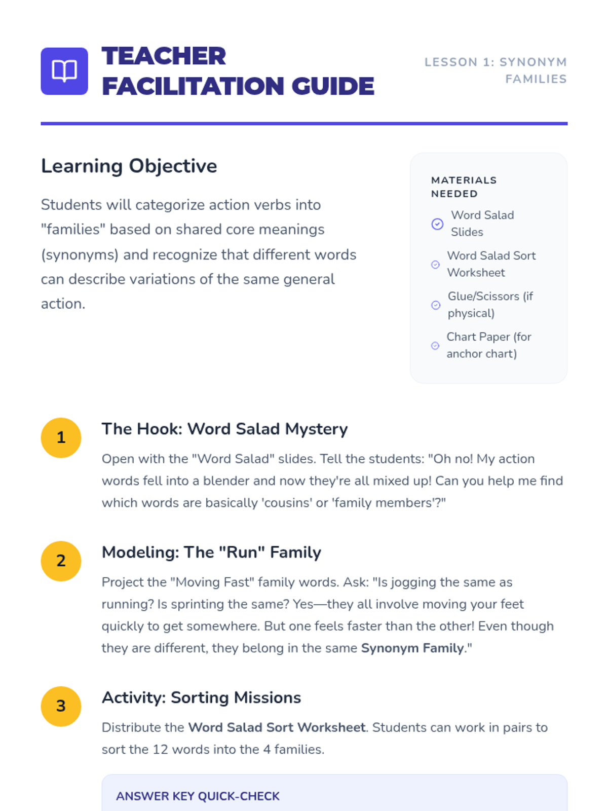 A foundational language arts sequence for 2nd graders focusing on word morphology (prefixes and suffixes) and parts of speech (adverbs), using a laboratory-themed investigative approach to help students decode meaning.