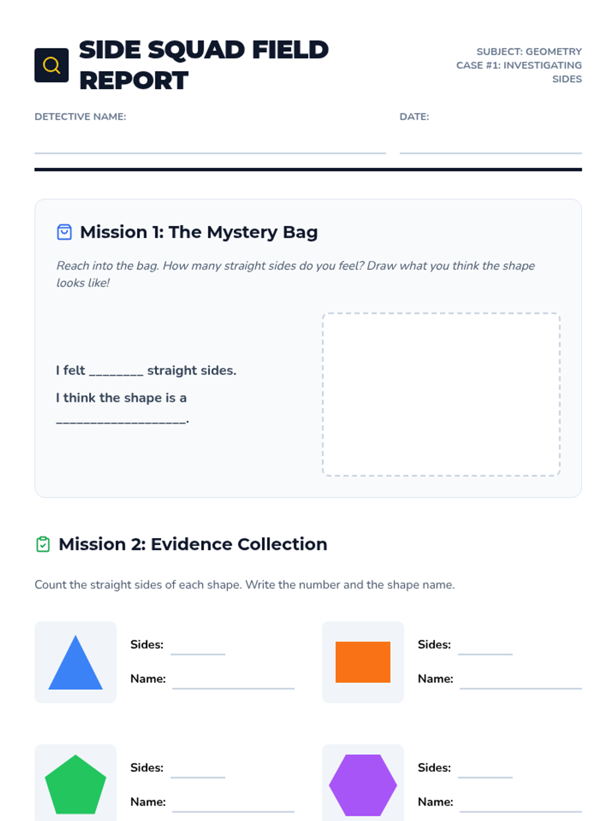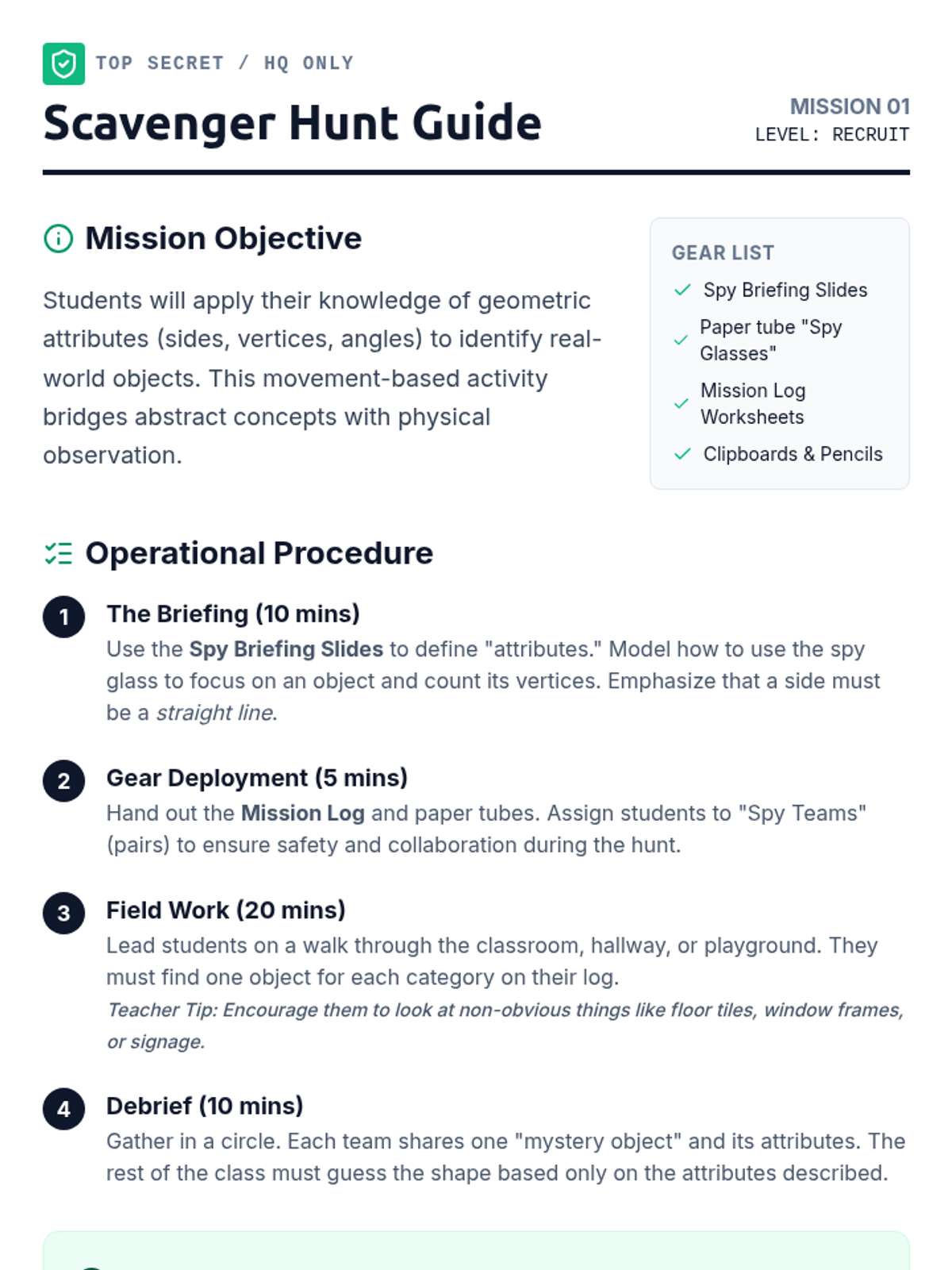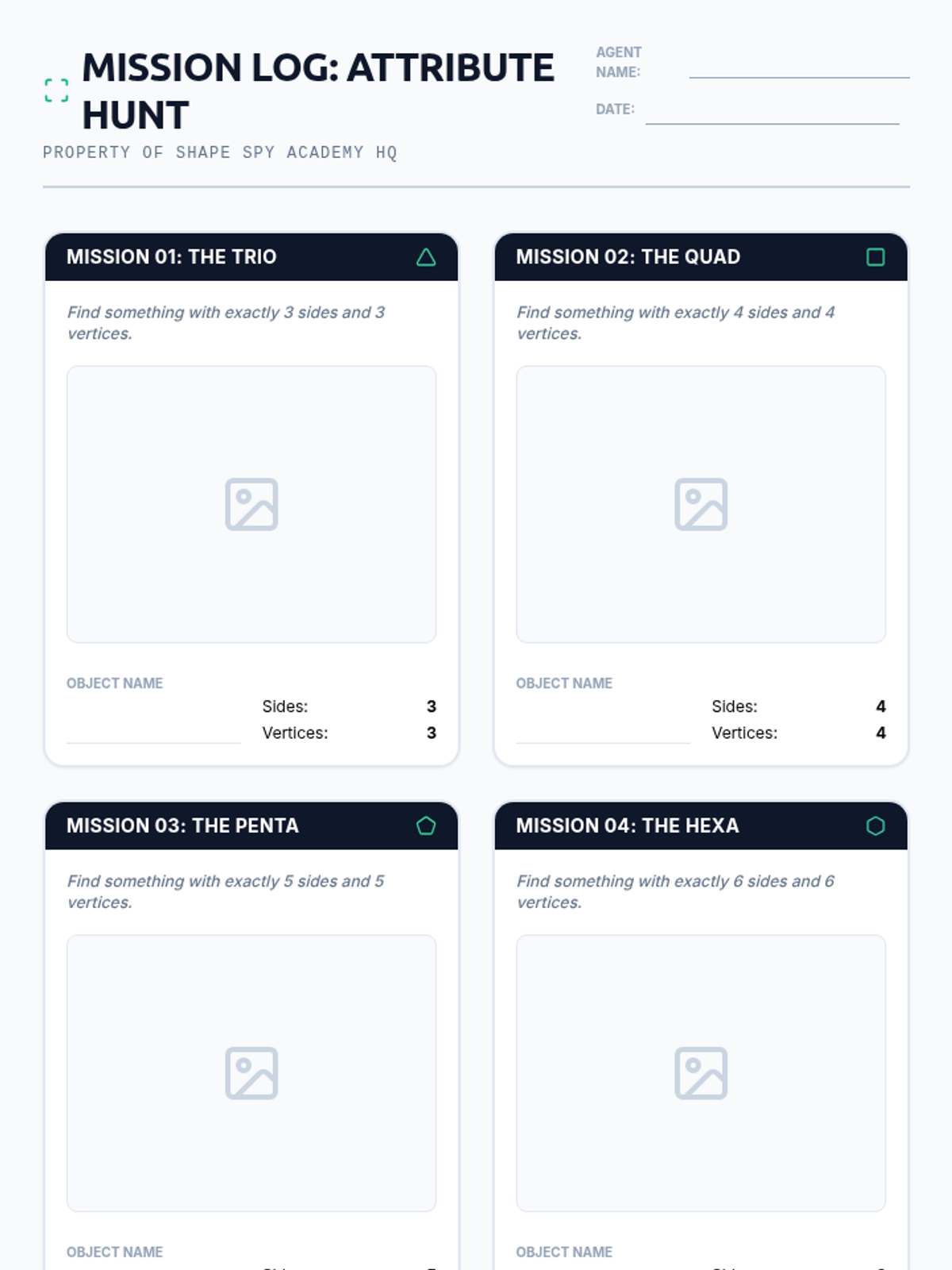 A game-based 2nd grade geometry unit where students become 'Shape Spies' to master attributes, classification, and logical deduction through interactive challenges.