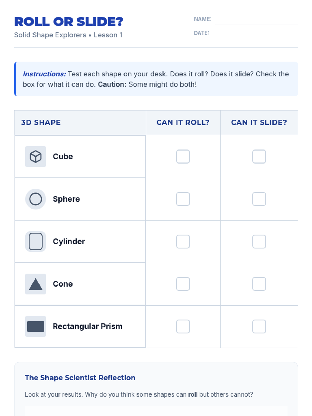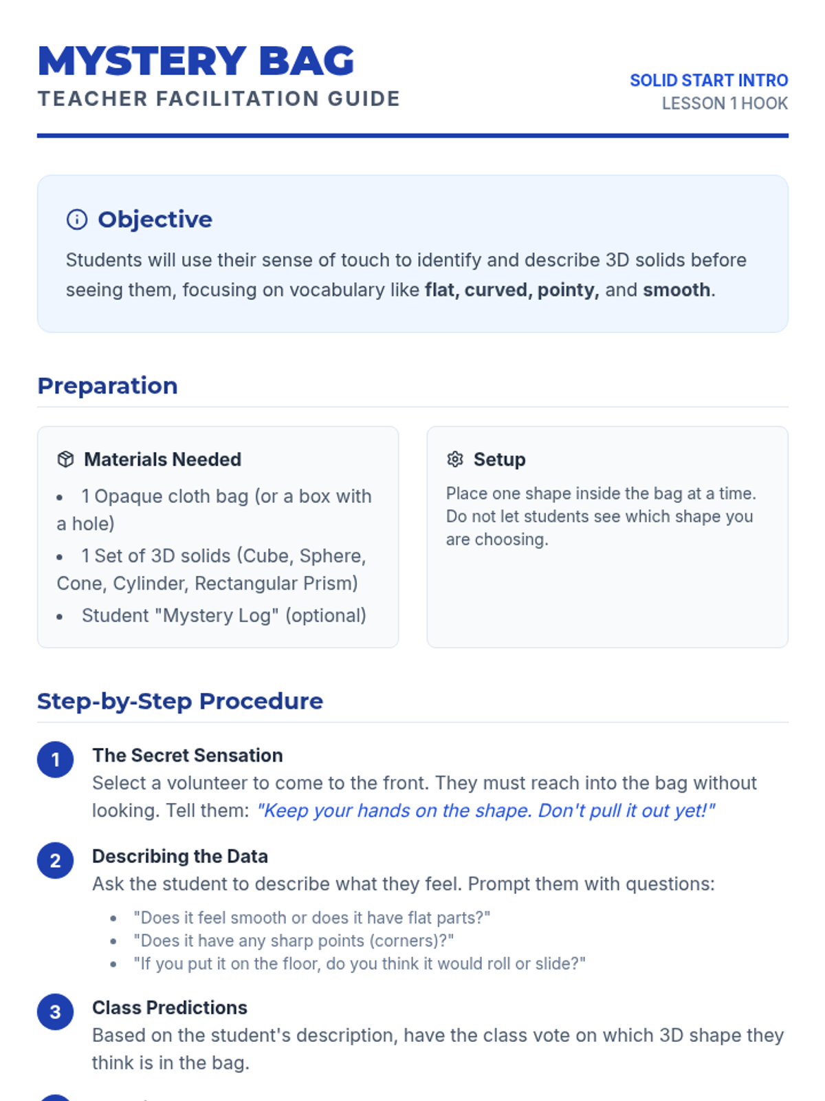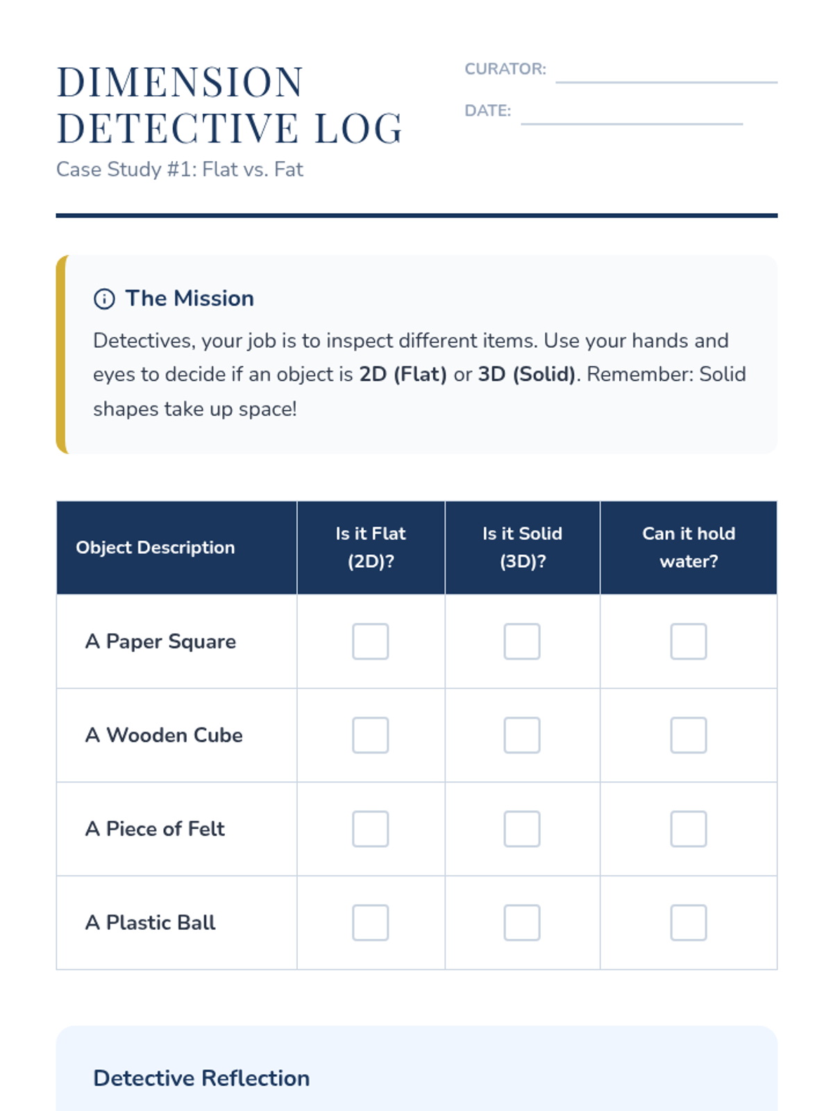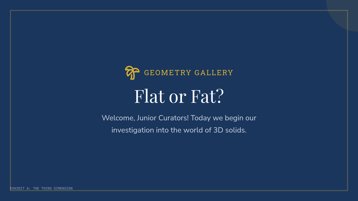 A 2nd-grade geometry unit where students act as museum curators to explore the properties, behaviors, and real-world applications of 3D solids. Students progress from distinguishing 2D from 3D to analyzing complex attributes and curating their own 'Geometry Museum'.