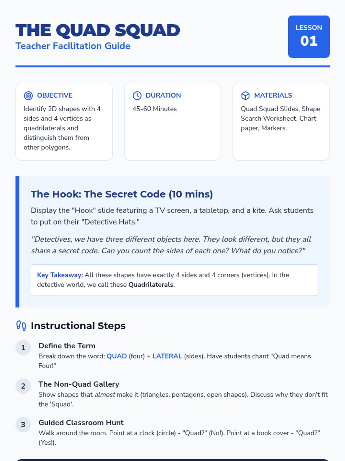 This sequence explores the classification of quadrilaterals for 2nd graders, moving from basic recognition to hierarchical understanding of attributes like right angles and equal side lengths. Students will learn to identify squares, rectangles, rhombuses, and trapezoids, ultimately understanding that shapes can belong to multiple categories.