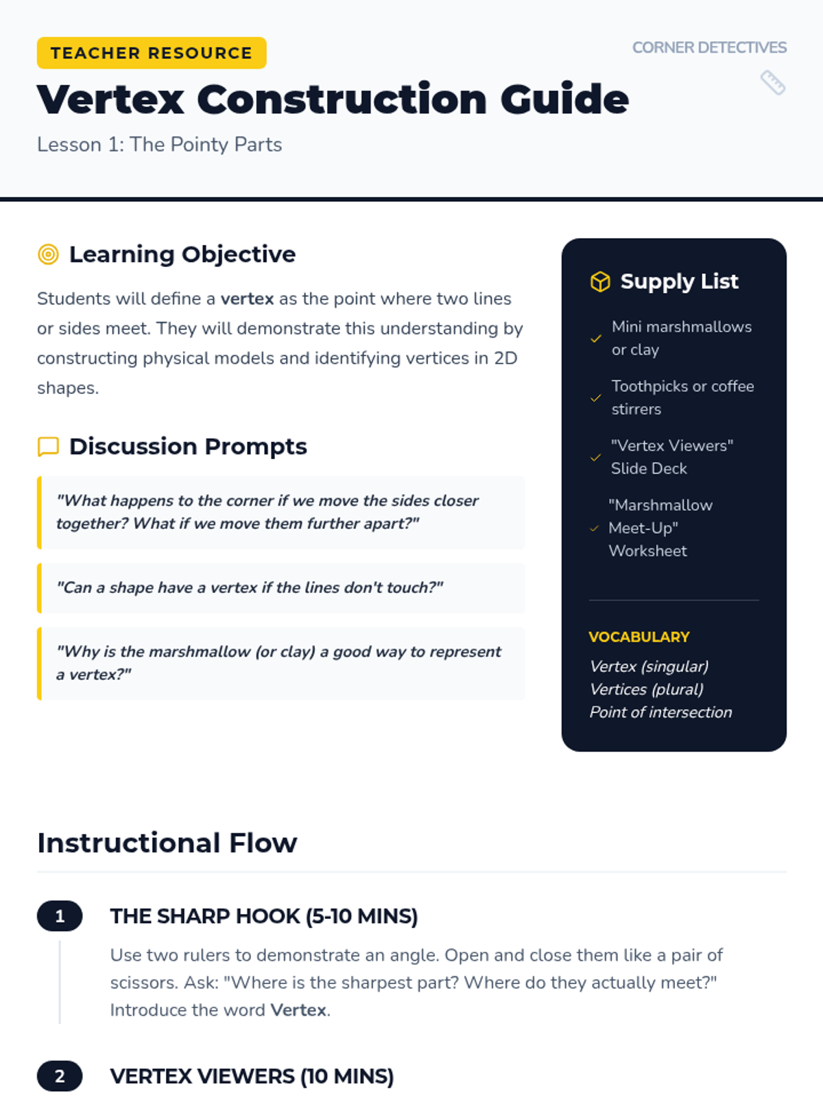 A 2nd Grade geometry sequence focusing on vertices and angles. Students learn to identify vertices, recognize square corners (right angles) using tools, compare angle sizes, and draw precise polygons with specific corner types.