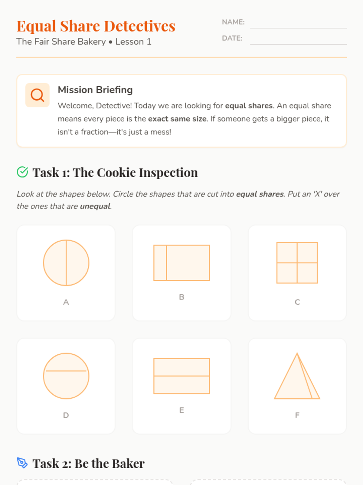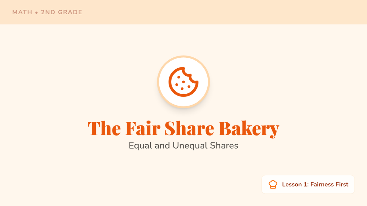 A 5-lesson 2nd Grade math unit exploring fractions through the lens of a bakery theme. Students learn to distinguish equal shares, partition shapes into halves, thirds, and fourths, name unit fractions, and understand that more shares result in smaller pieces.