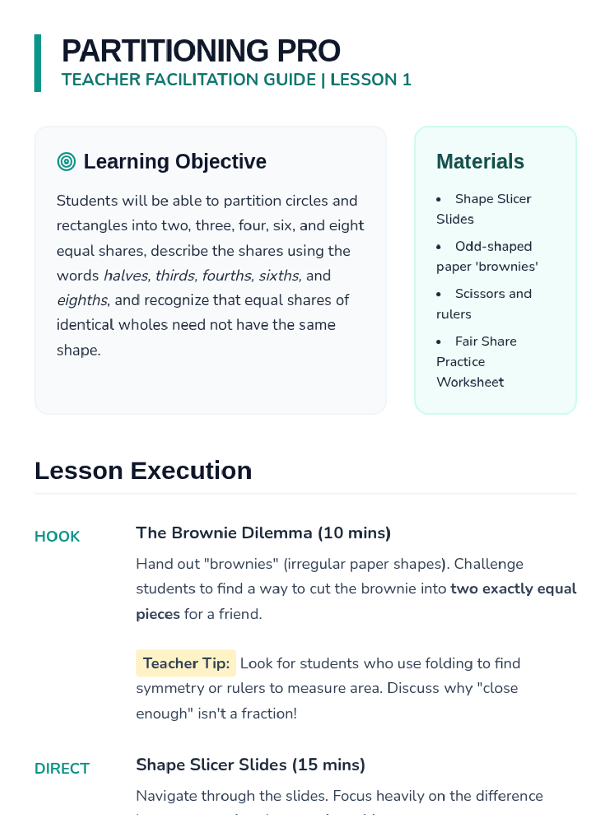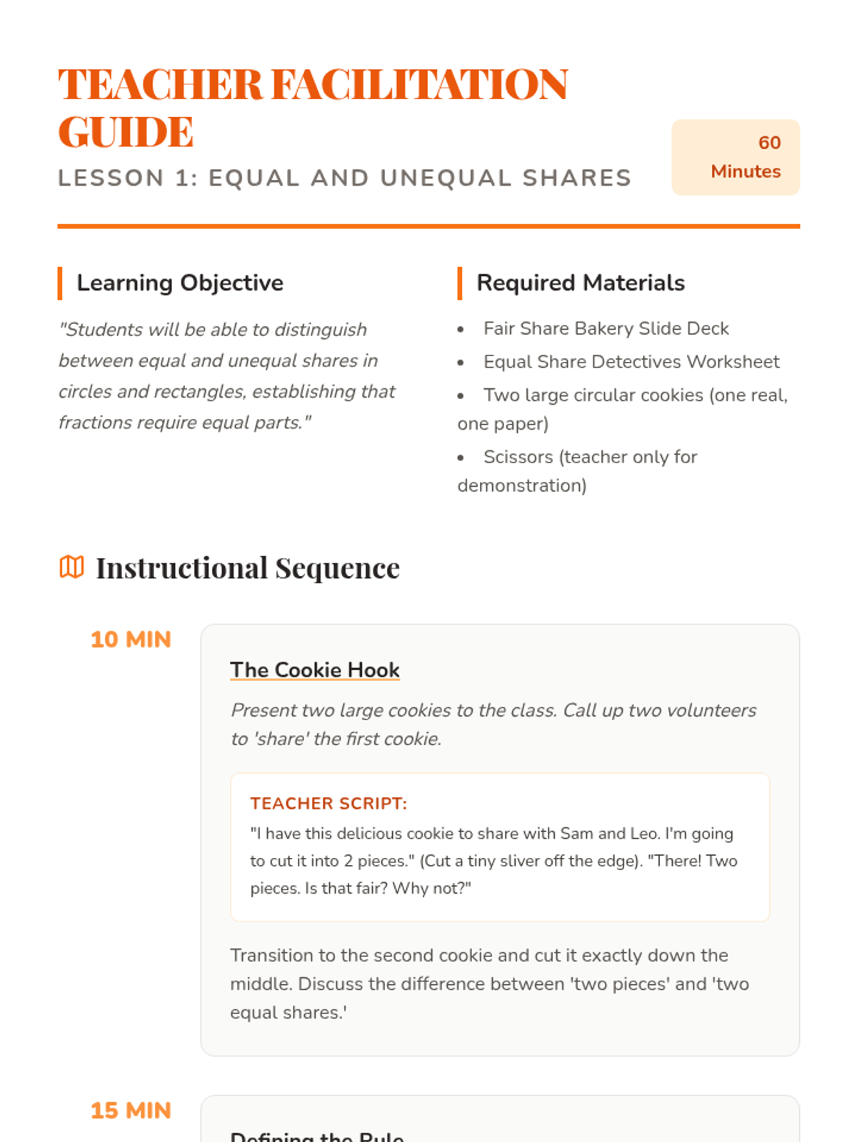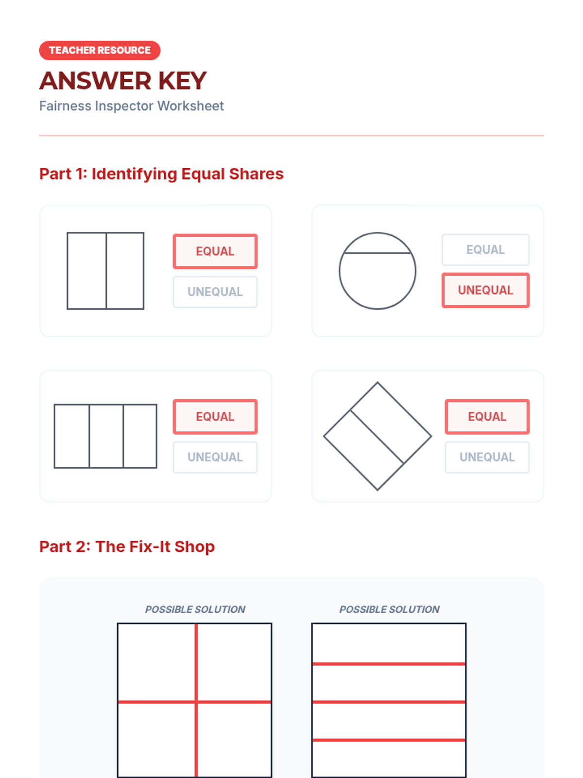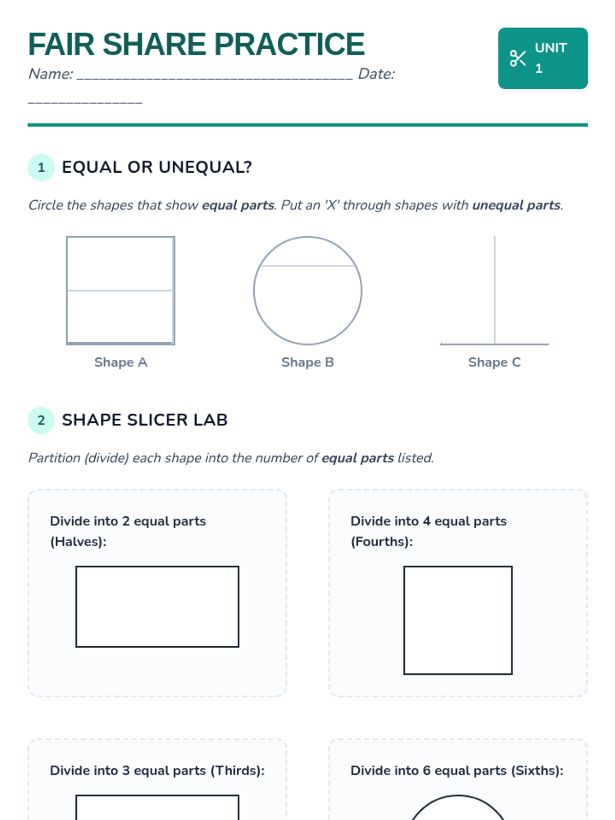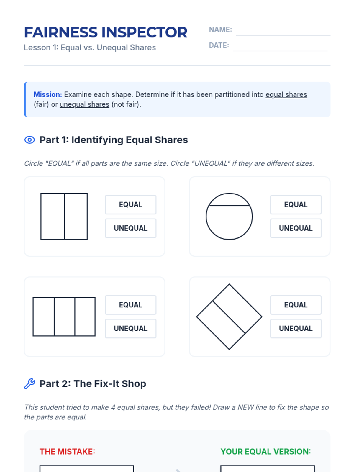 This sequence connects geometry to fractions by teaching students to partition shapes into parts with equal areas. Students move from intuitive sharing to precise geometric partitioning, learning that equal shares of identical wholes need not have the same shape.