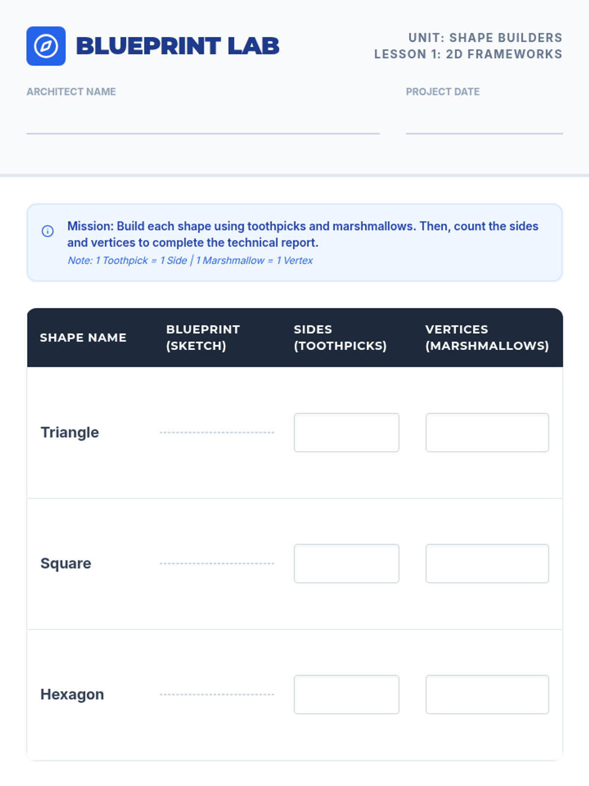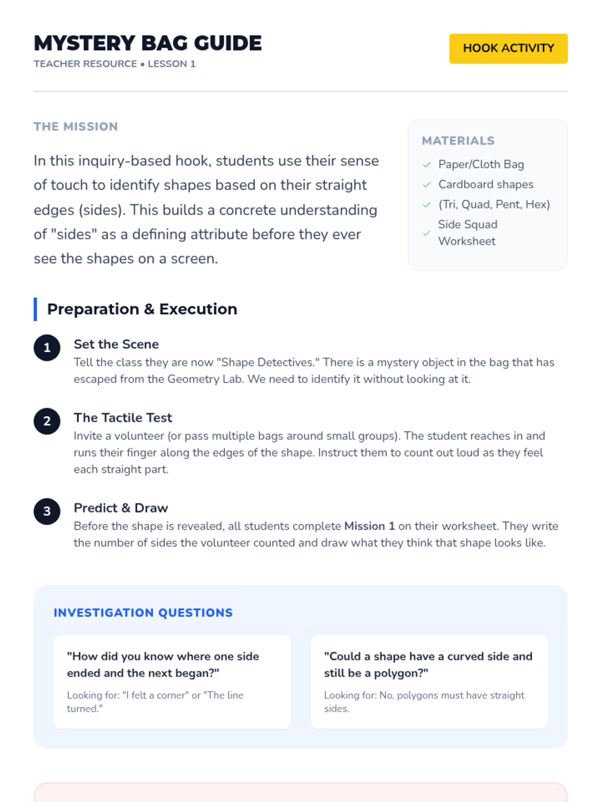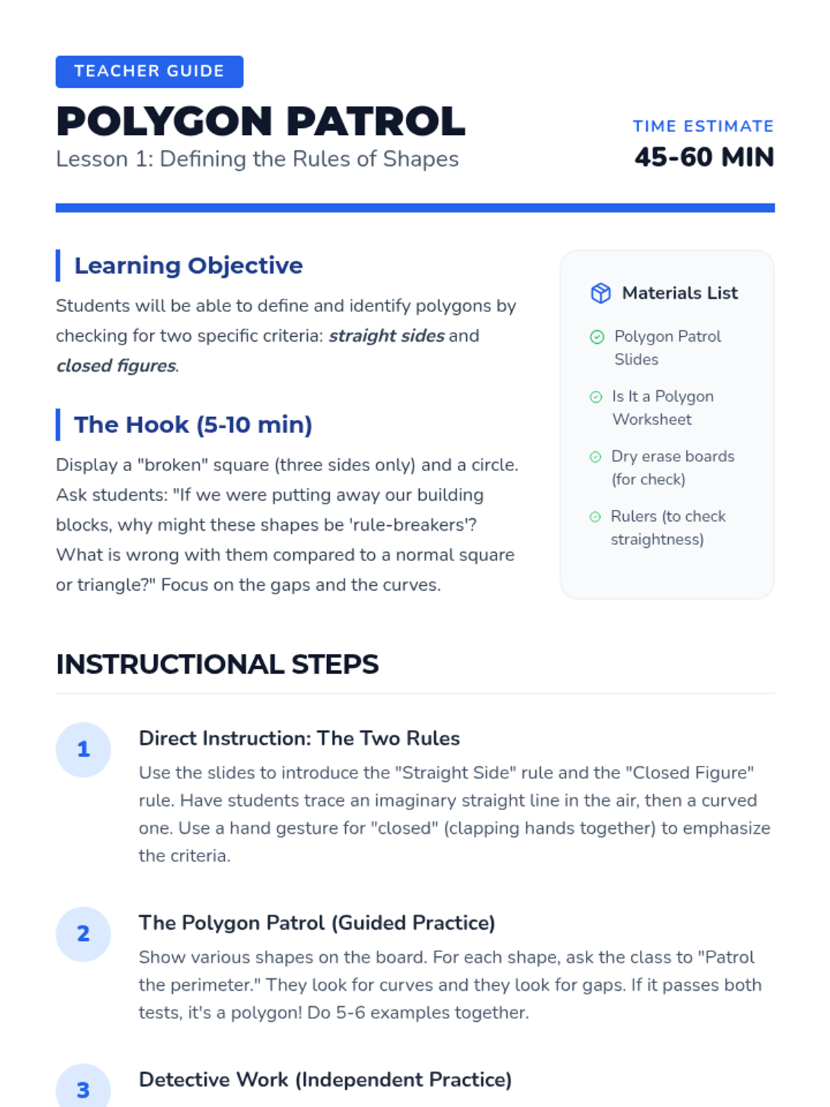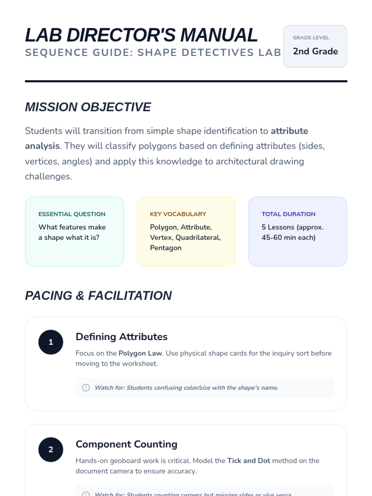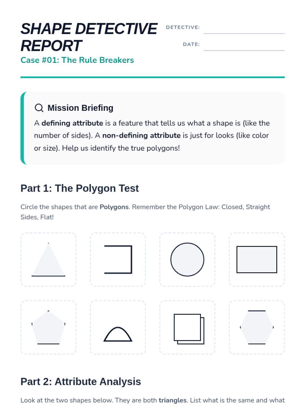 This inquiry-based geometry unit for 2nd grade focuses on defining attributes of two-dimensional polygons. Students move from sorting shapes by observation to drawing them by specific geometric rules, ultimately creating a comprehensive field guide of polygons.