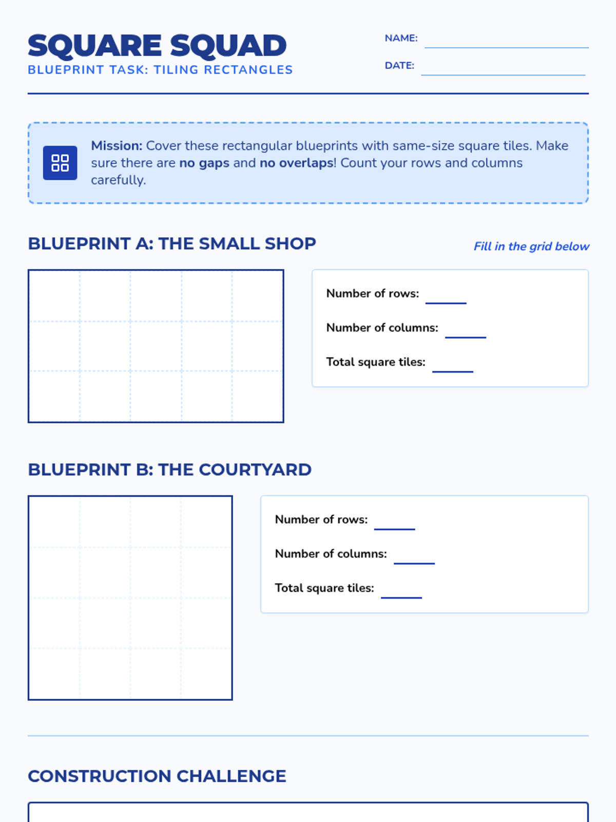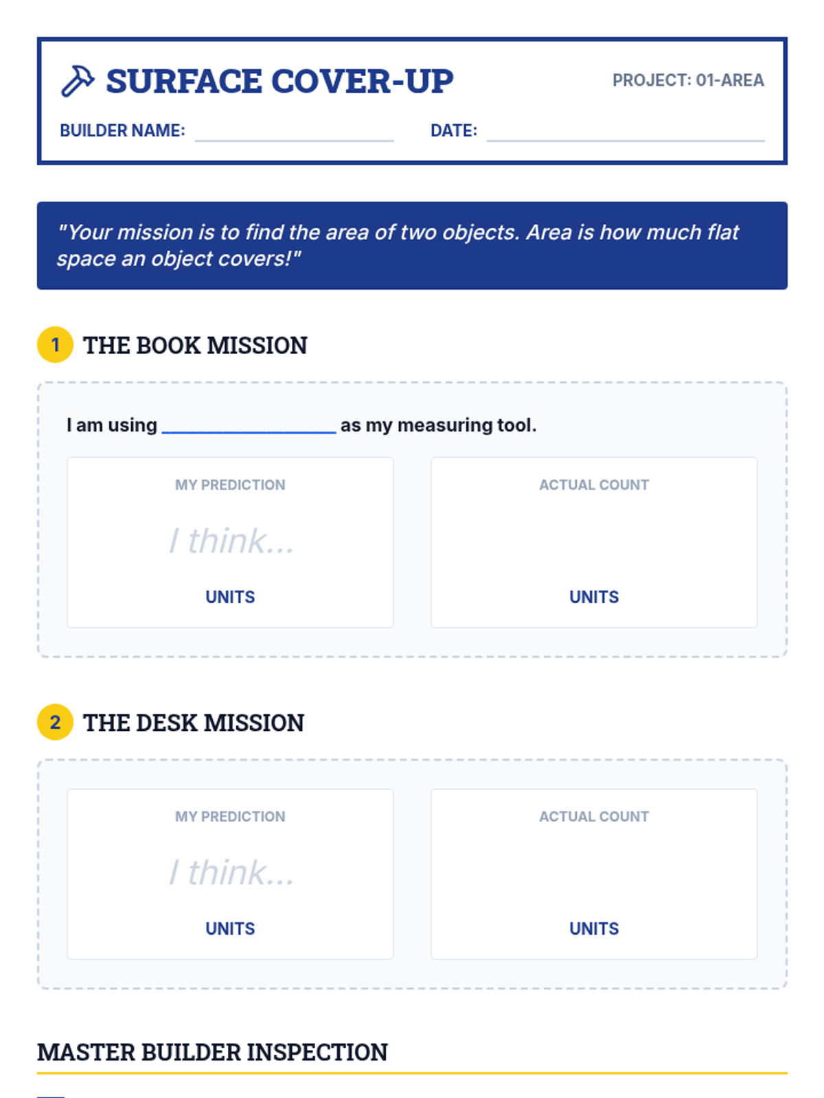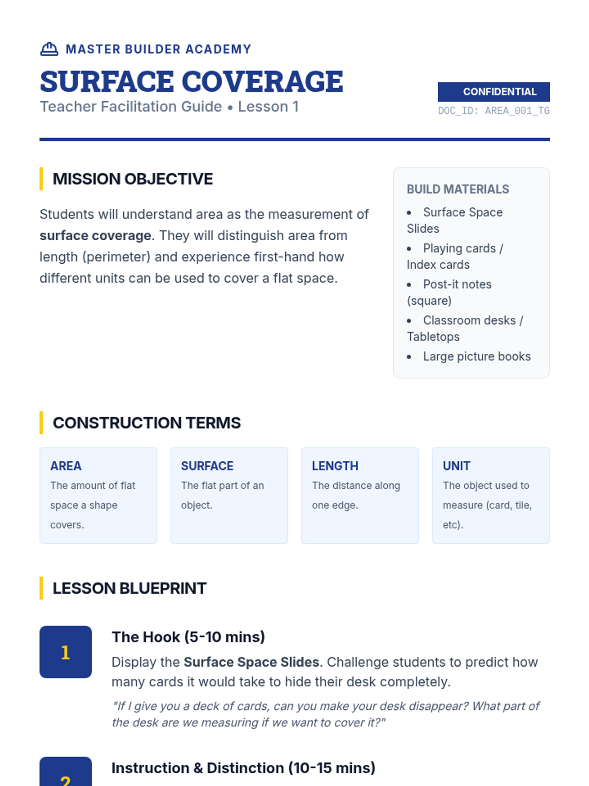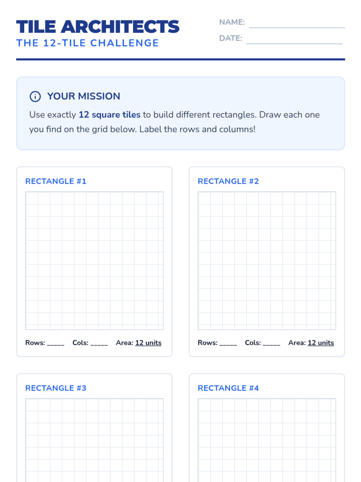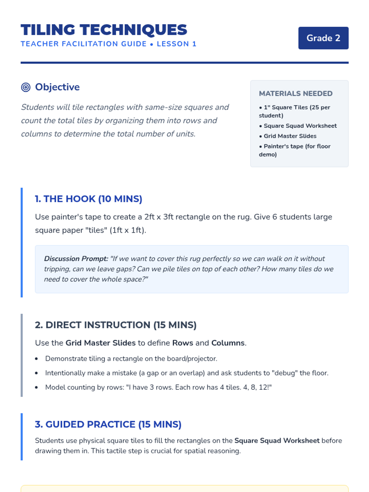 This 2nd Grade sequence introduces the concept of area as surface coverage. Students progress from using non-standard units to standard square tiles, discovering the essential rules of tiling (no gaps, no overlaps) and transitioning from concrete manipulation to pictorial grid representations.