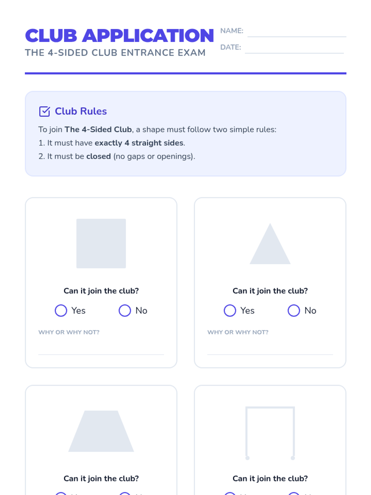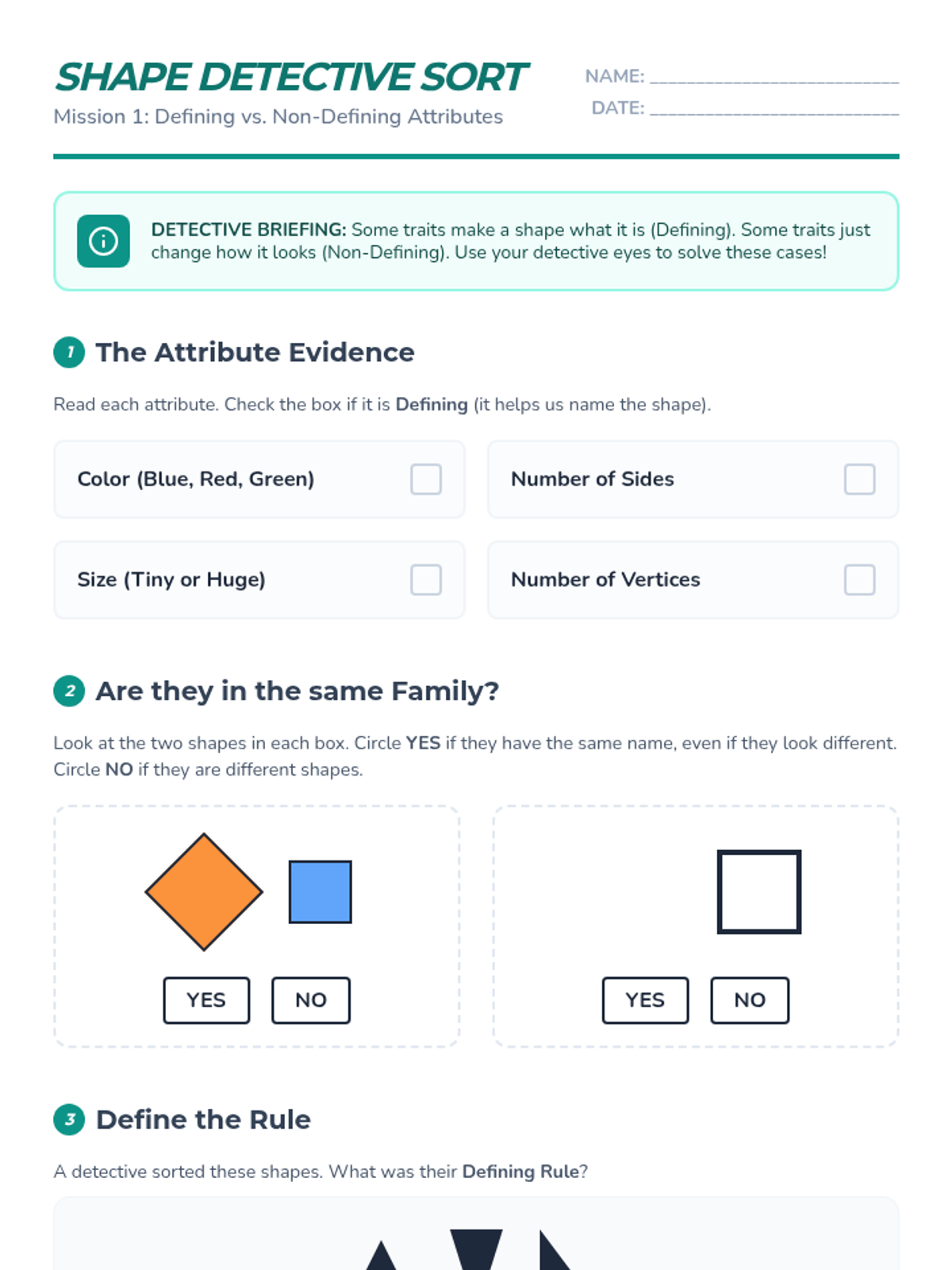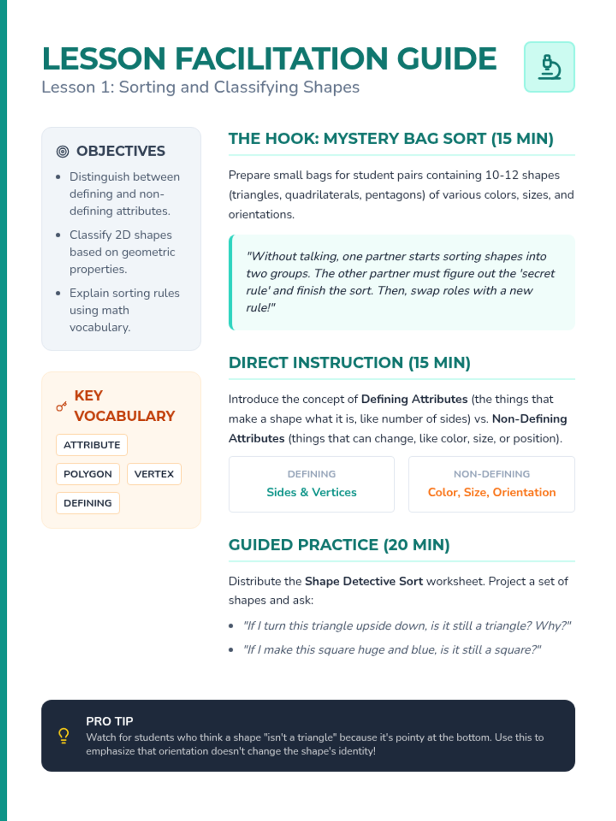 This mastery-based sequence focuses on precise mathematical communication and reasoning. Students engage in discussions and logic exercises to refine their definitions of shapes, moving beyond basic naming to attribute-based definitions and hierarchical relationships.