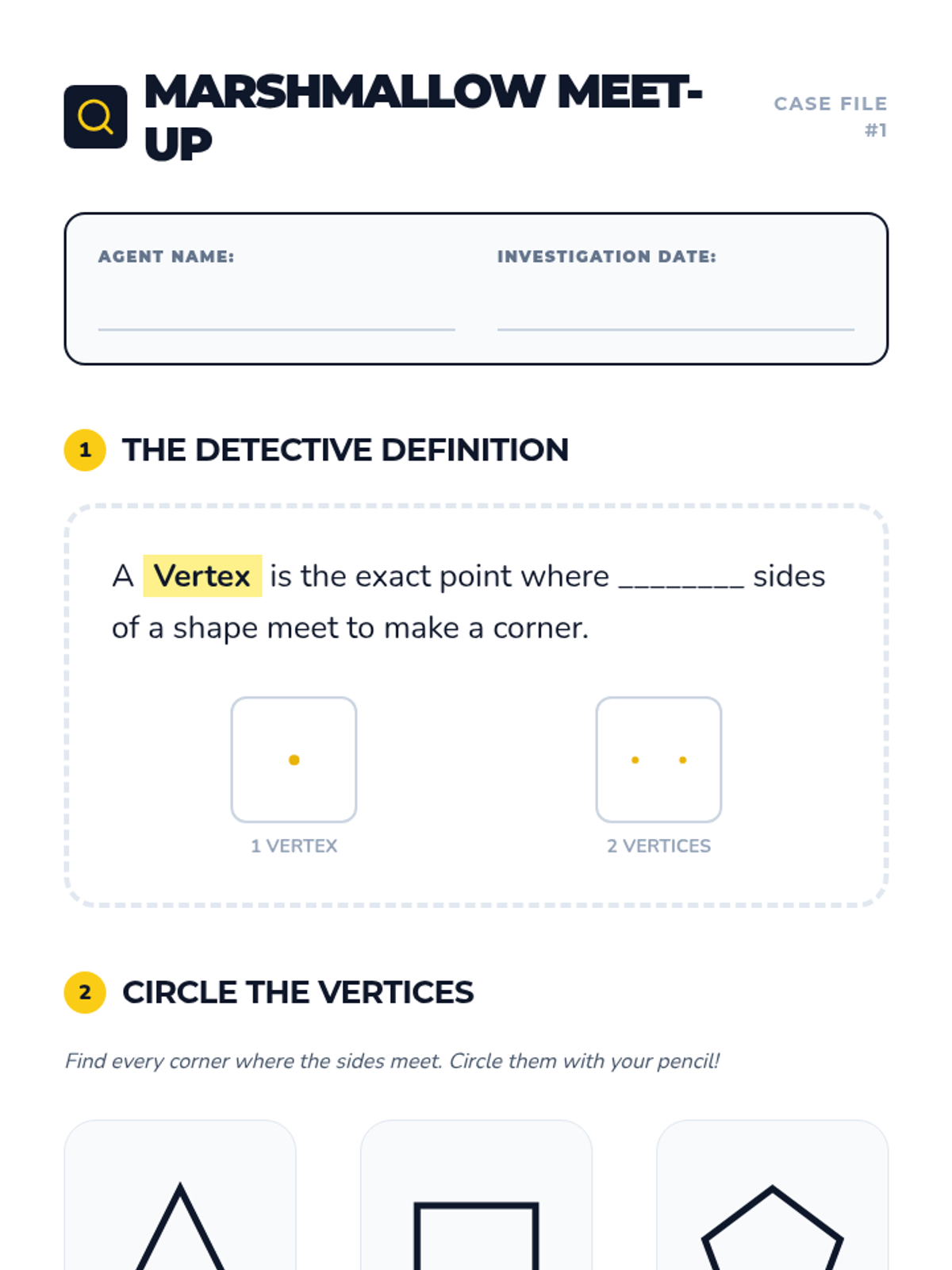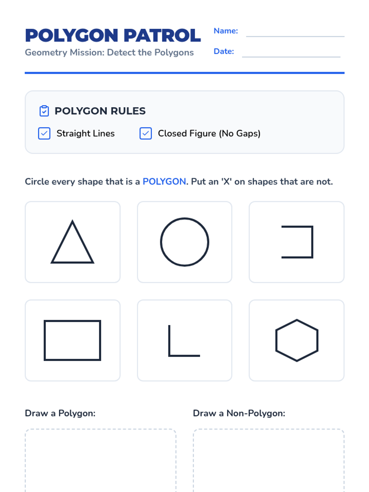 This sequence introduces 2nd-grade students to the fundamental properties of two-dimensional polygons, moving from identifying open/closed figures to classifying and drawing shapes based on their attributes. Students will learn to recognize triangles, quadrilaterals, pentagons, and hexagons by counting sides and vertices, regardless of size or orientation.