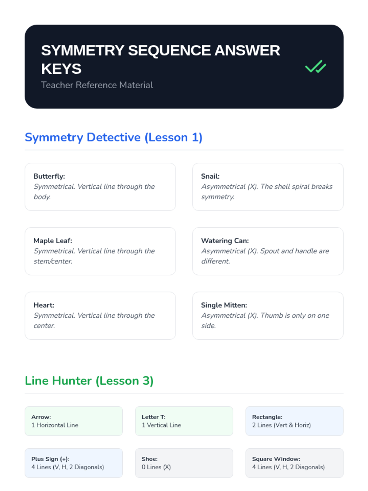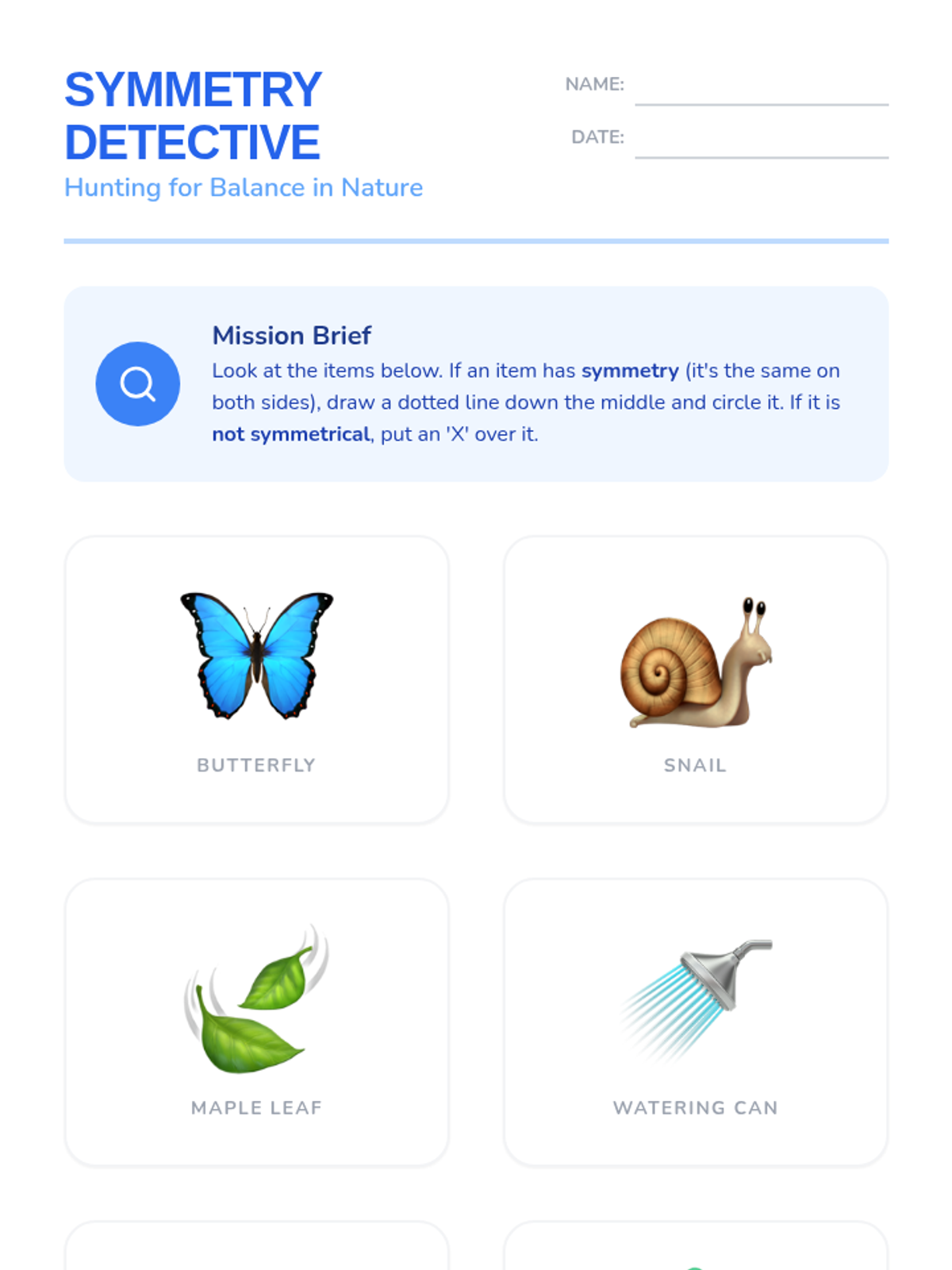 A 2nd-grade geometry sequence exploring line symmetry through real-world analysis, physical folding, drawing, and artistic creation. Students learn to identify and create mirror images, culminating in a paint-blot art project.