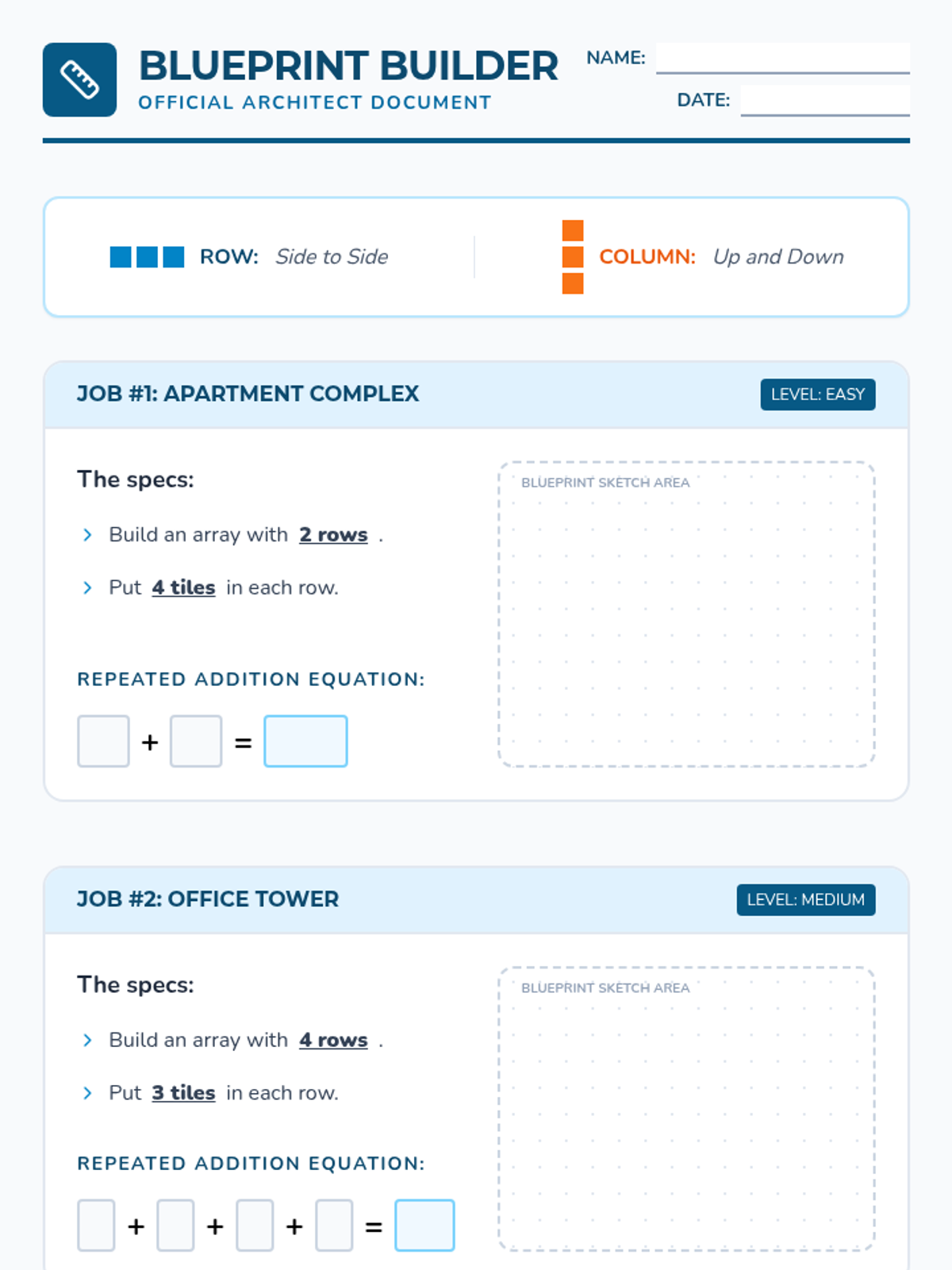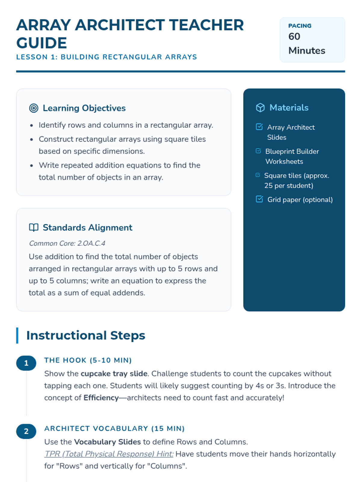A 2nd-grade sequence exploring the properties of operations through rectangular arrays and repeated addition. Students transition from building basic arrays to understanding commutative and distributive concepts, culminating in an 'Array City' project.