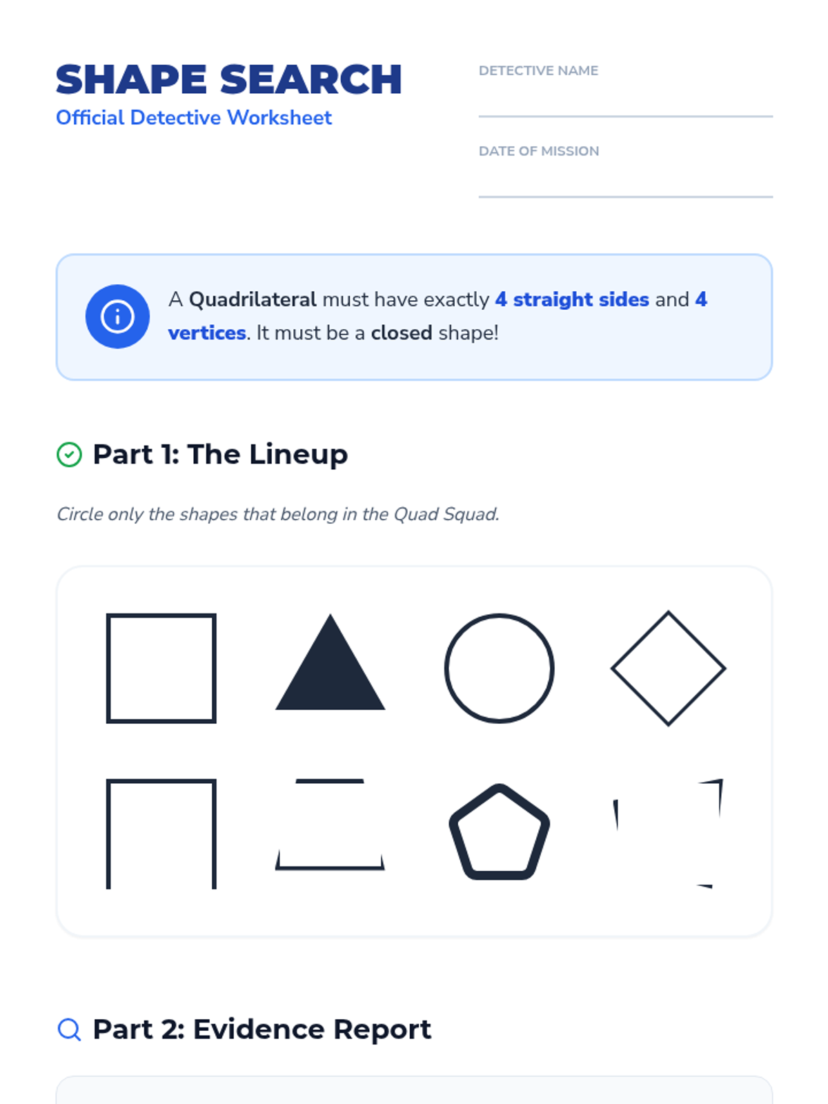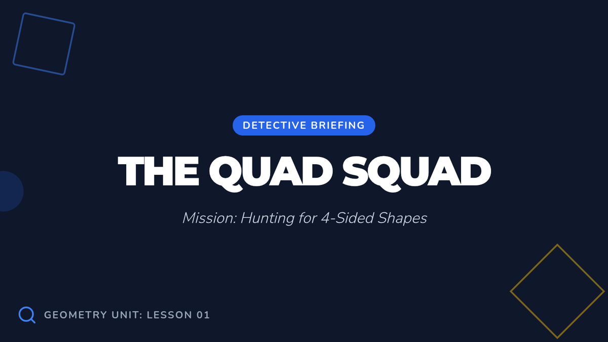 A 2nd-grade geometry unit focused on classifying quadrilaterals based on side lengths, square corners, and parallel lines, culminating in a 'Quadrilateral Field Guide'.