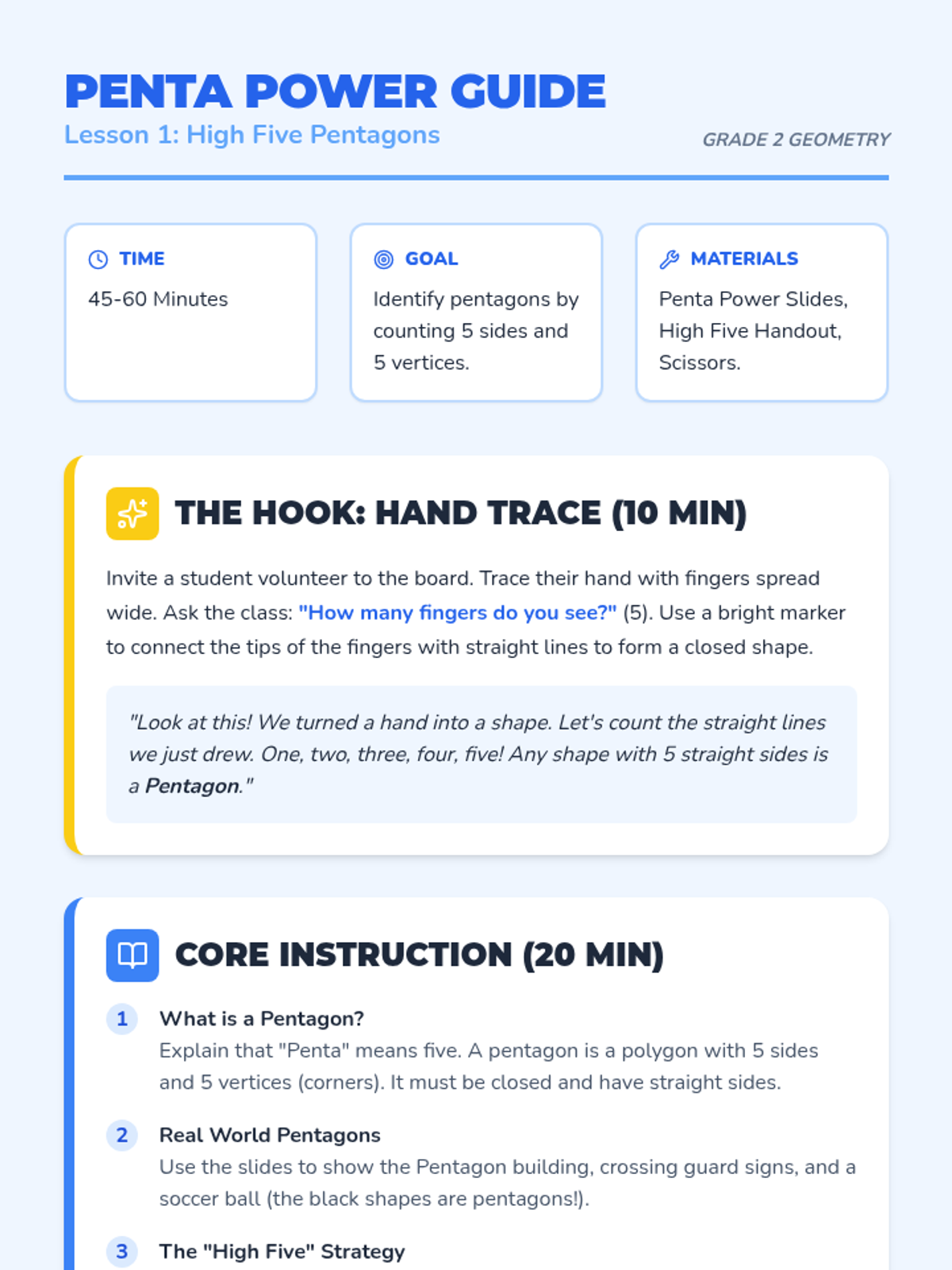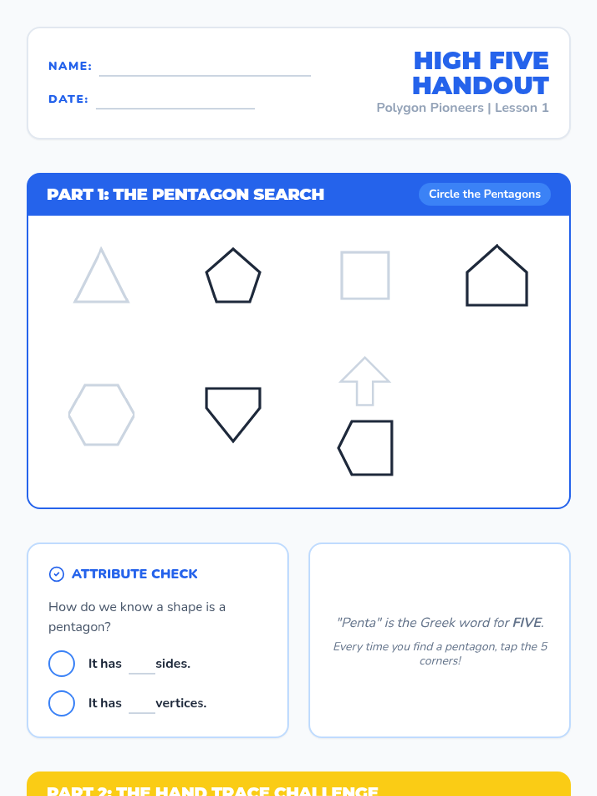 A comprehensive 2nd Grade geometry sequence focused on identifying and classifying pentagons and hexagons. Students progress from basic attribute recognition to identifying irregular polygons and creating tessellating patterns through games and hands-on activities.