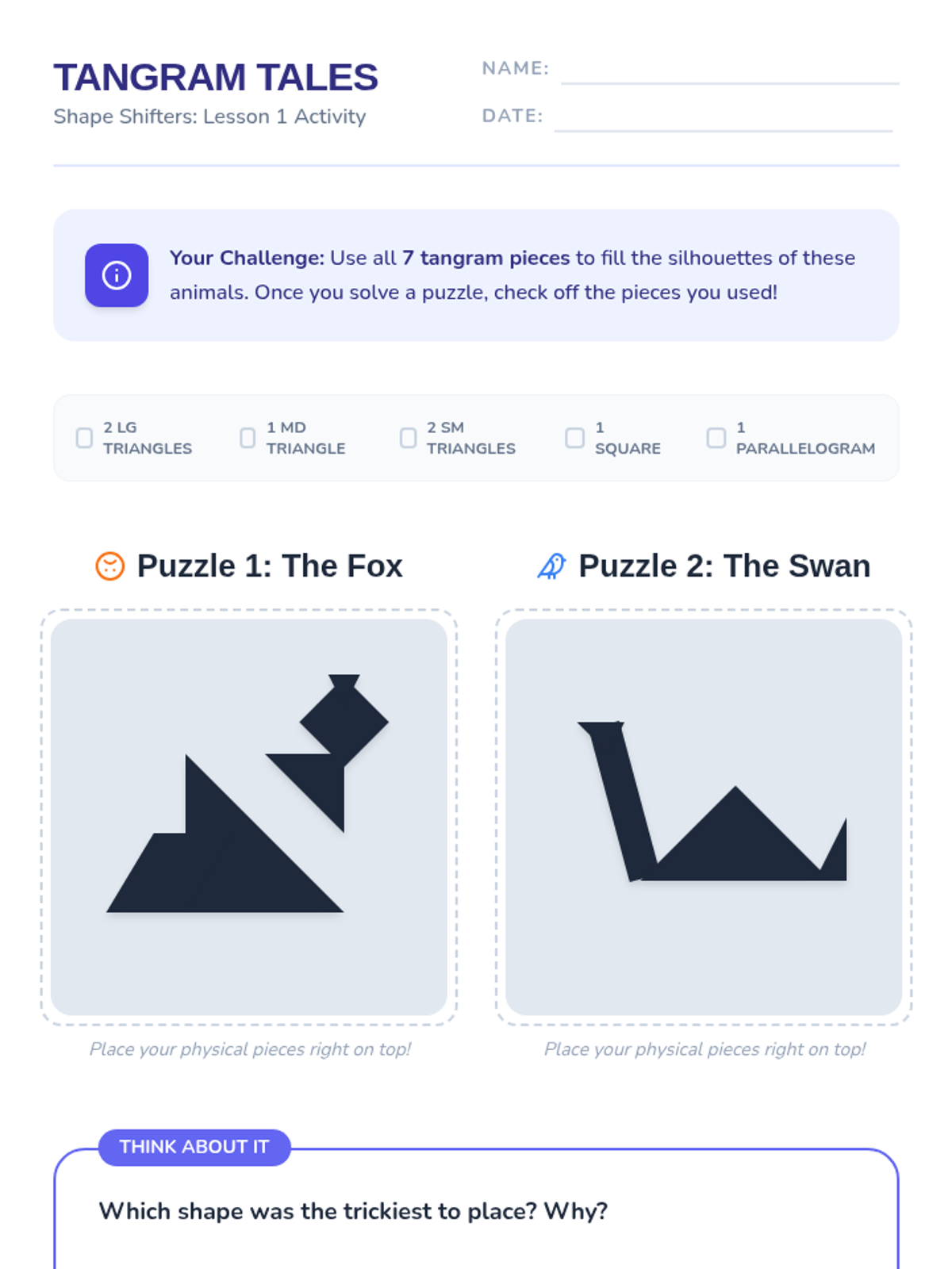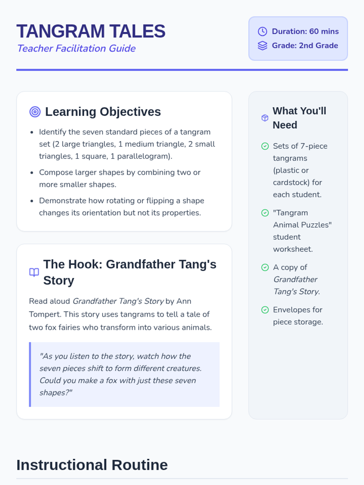 A 1st-grade geometry sequence exploring how shapes combine and break apart. Students use hands-on materials like tangrams, pattern blocks, and geoboards to develop spatial reasoning and understand the part-whole relationship in geometric figures.