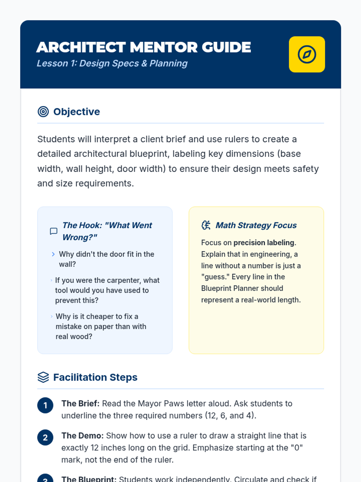 A project-based unit where 2nd-grade students act as architects and engineers to design and build 'Tiny Town' structures. Students learn to measure accurately, calculate perimeter, and verify dimensions against design plans.
