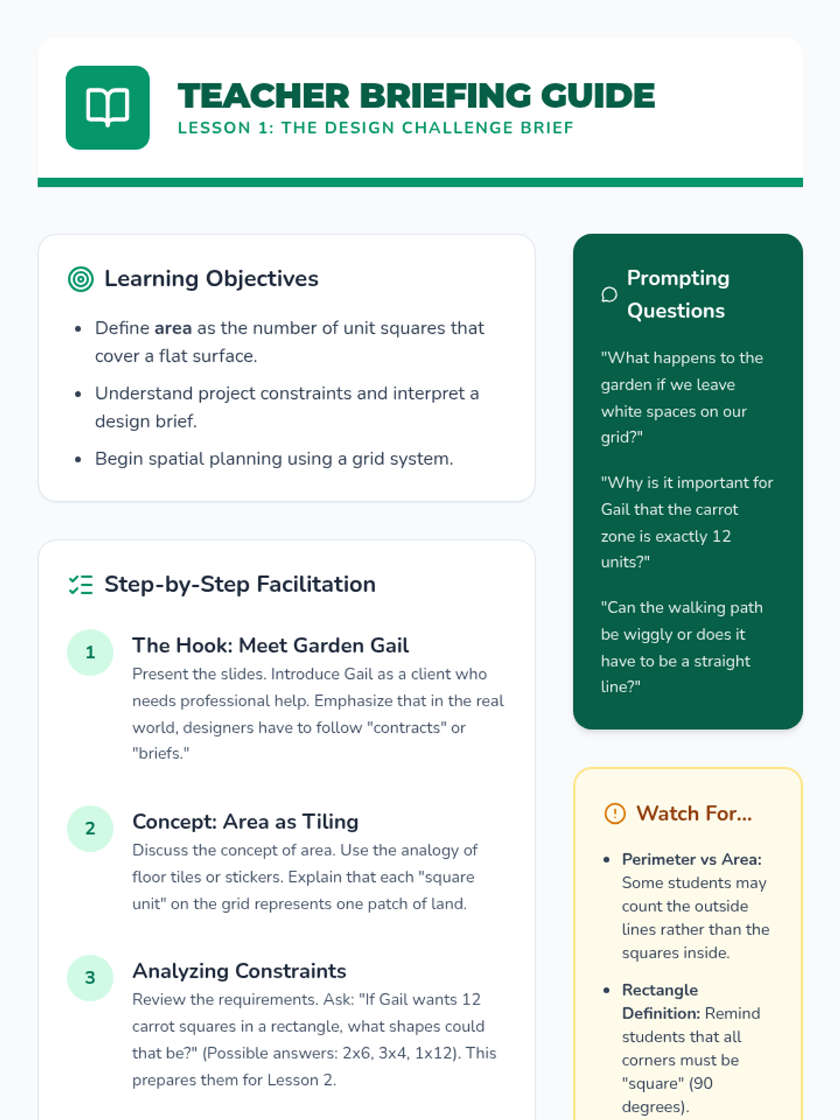 Students step into the shoes of garden designers to learn area. They use 1-inch grids to plan, calculate, and verify the layout of 'Dream Gardens', connecting the concept of square units to real-world spatial planning.