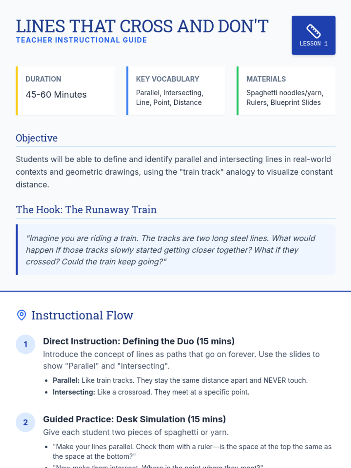 A hands-on geometry sequence where students explore the building blocks of angles, identify right angles in their environment, and classify angles as acute, obtuse, or straight through inquiry and shape analysis.