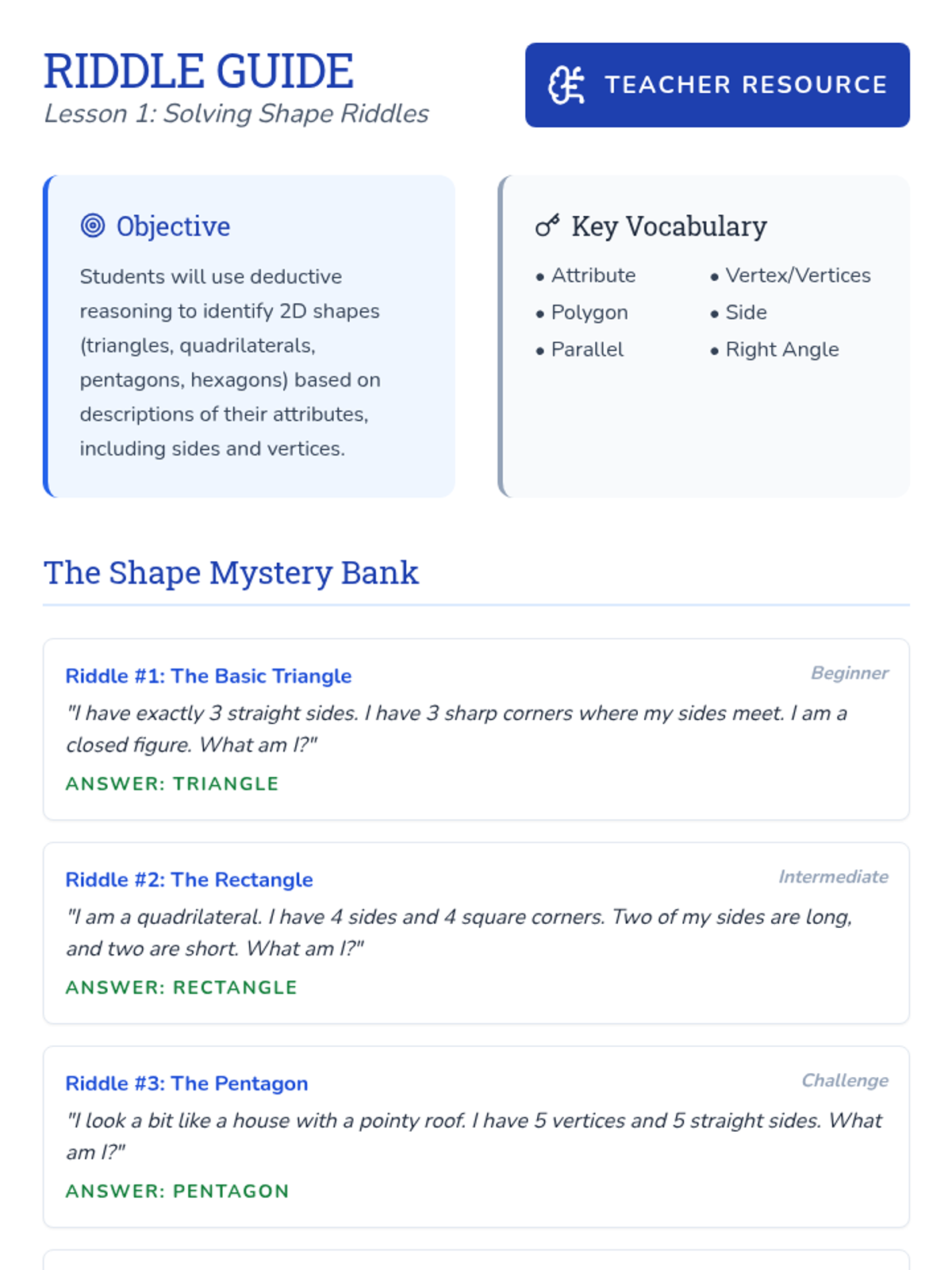 A game-based sequence for 2nd grade focusing on the logical categorization of geometric figures and the quadrilateral family. Students explore defining versus non-defining attributes through sorting games, riddles, and a culminating museum curation project.
