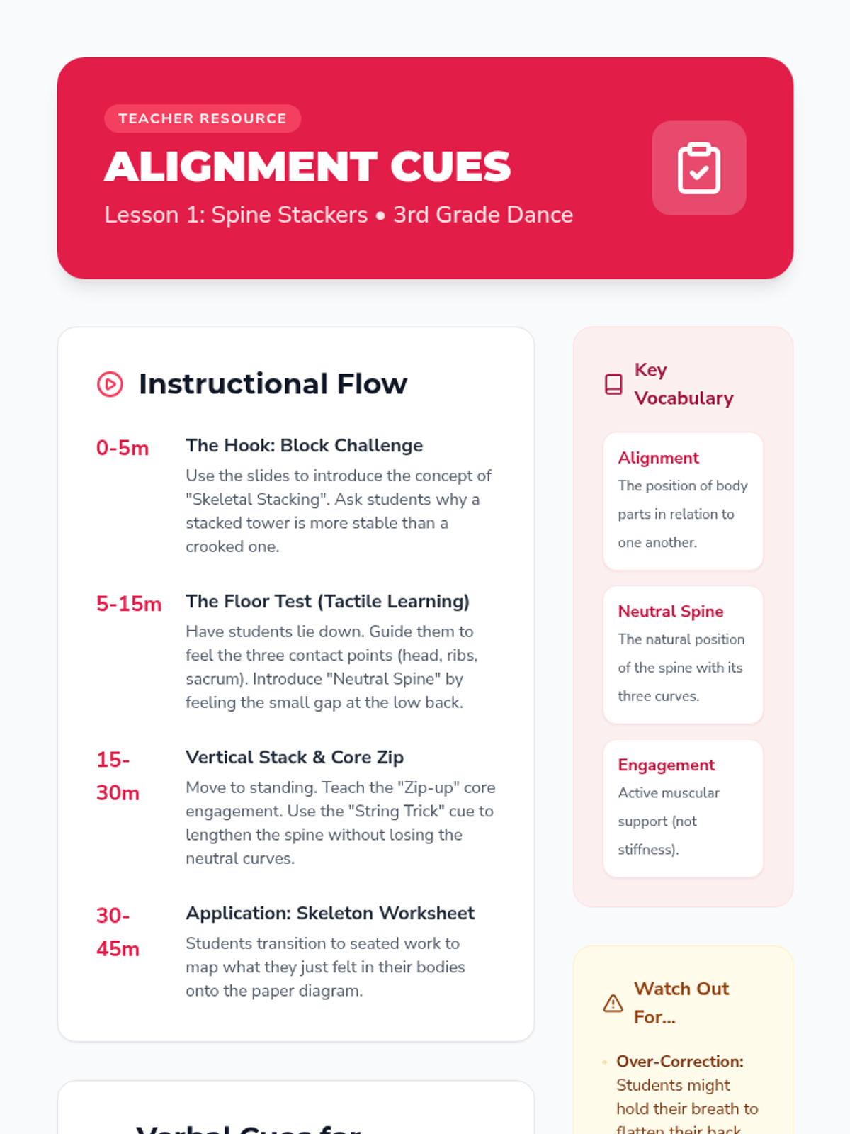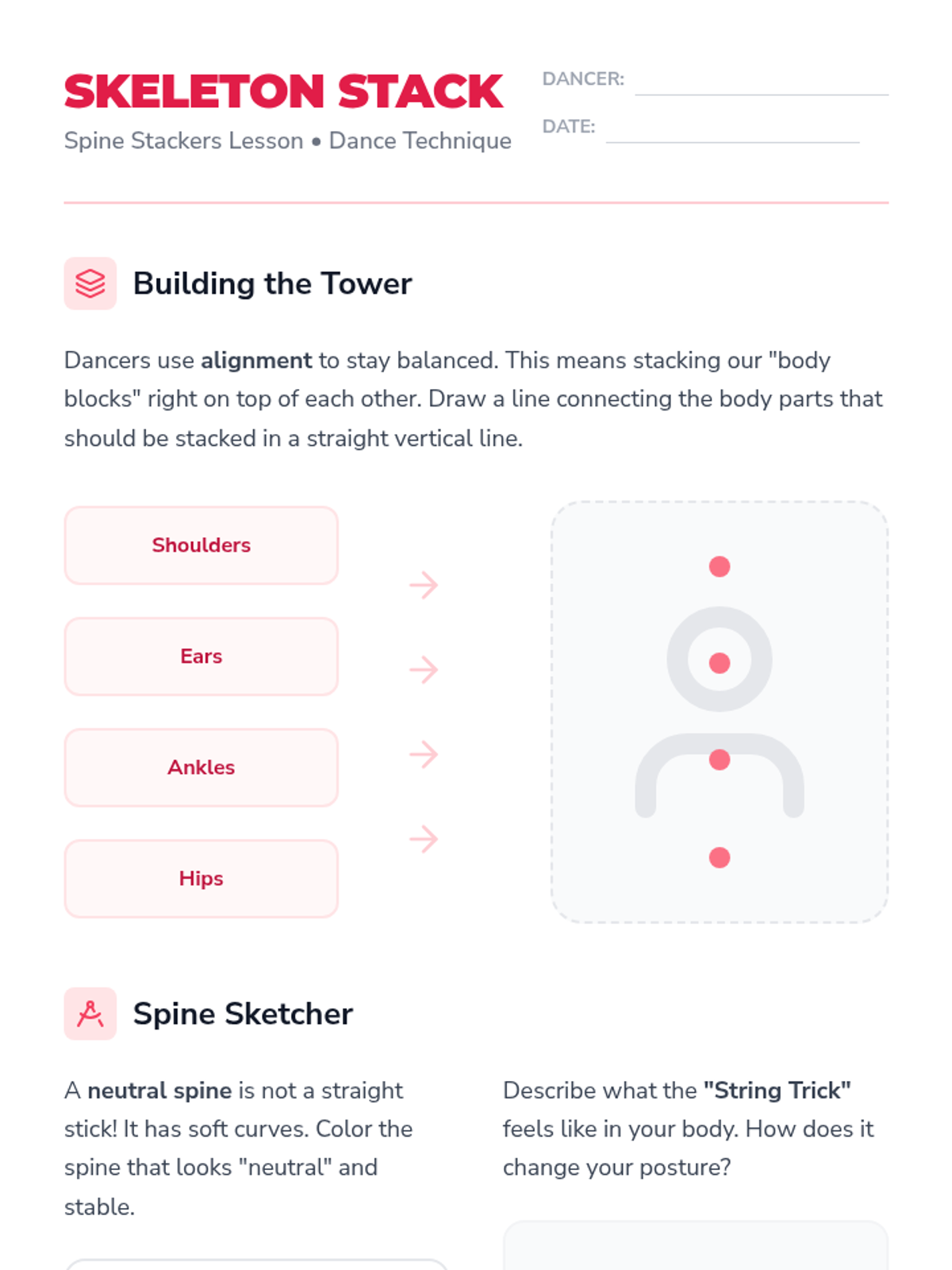 A foundational dance sequence for 3rd graders focusing on skeletal alignment, core stability, and basic technique. Students move from static posture to dynamic movement using ballet-based fundamentals like pli\u00e9s, relev\u00e9s, and spotting.