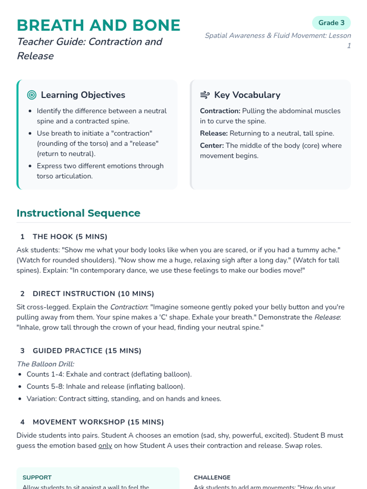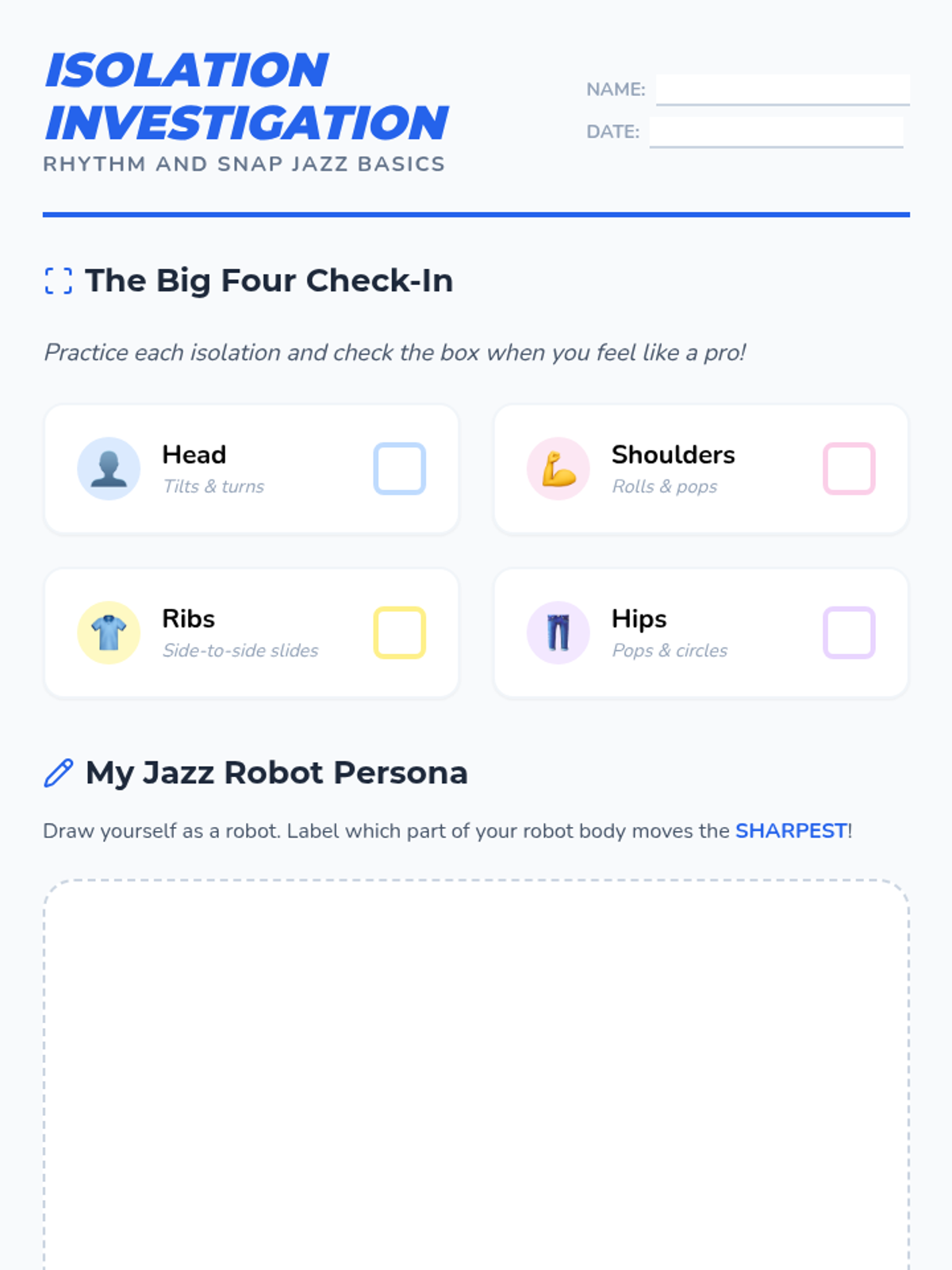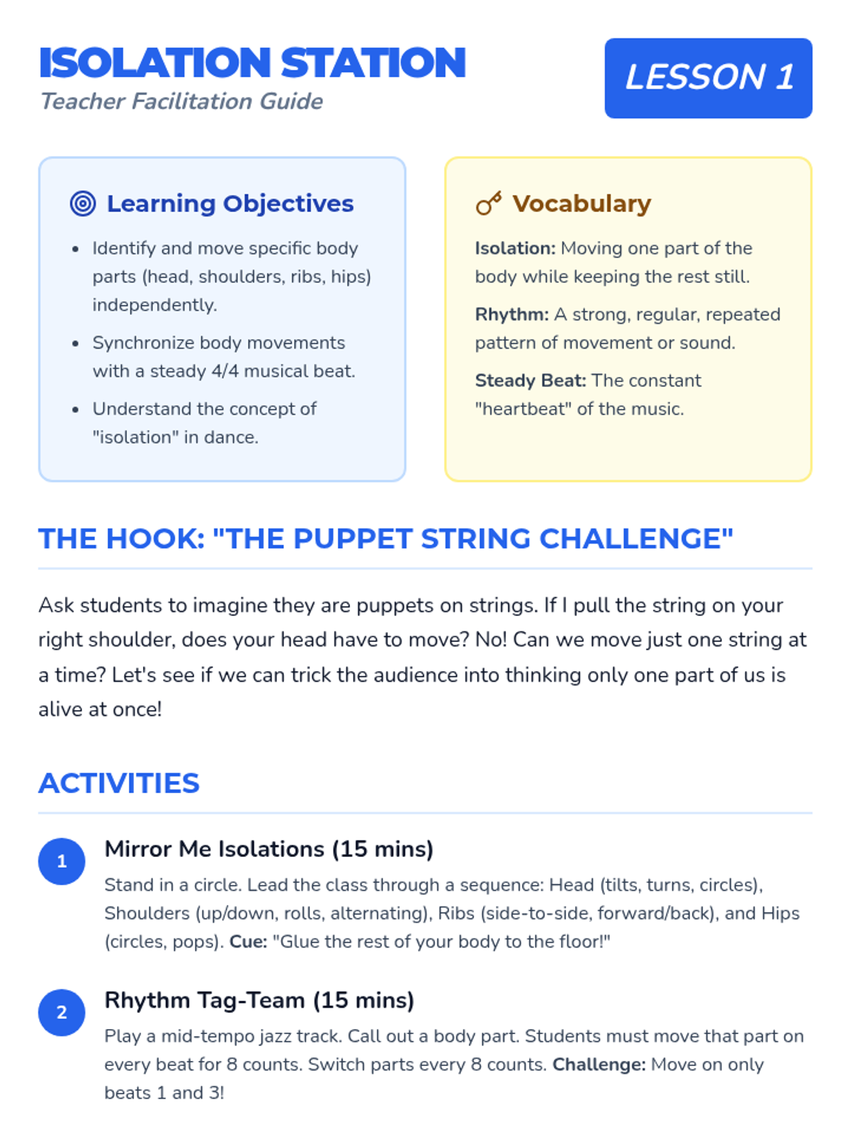 This sequence introduces 3rd-grade students to the fundamental techniques of jazz dance, focusing on body isolations, rhythmic footwork, and stylized movement. Students progress from simple isolations to complex steps like the pas de bourrée, culminating in a choreographed performance that emphasizes precision and energy.