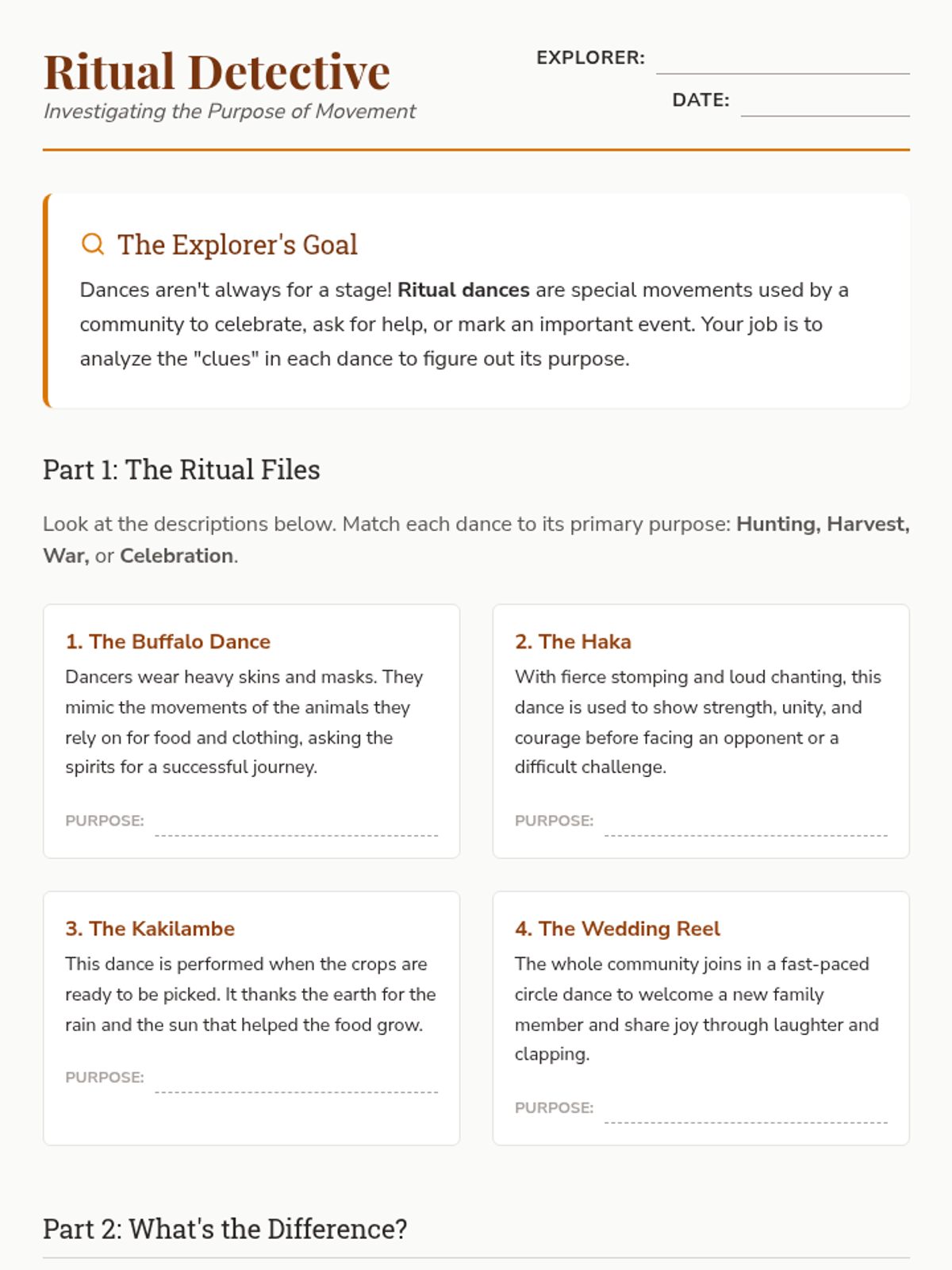 A 3rd-grade dance history sequence exploring the functional origins of dance in ancient and indigenous communities. Students investigate how movement serves rituals of worship, harvest, and community building across Native American, West African, and Ancient Greek cultures.