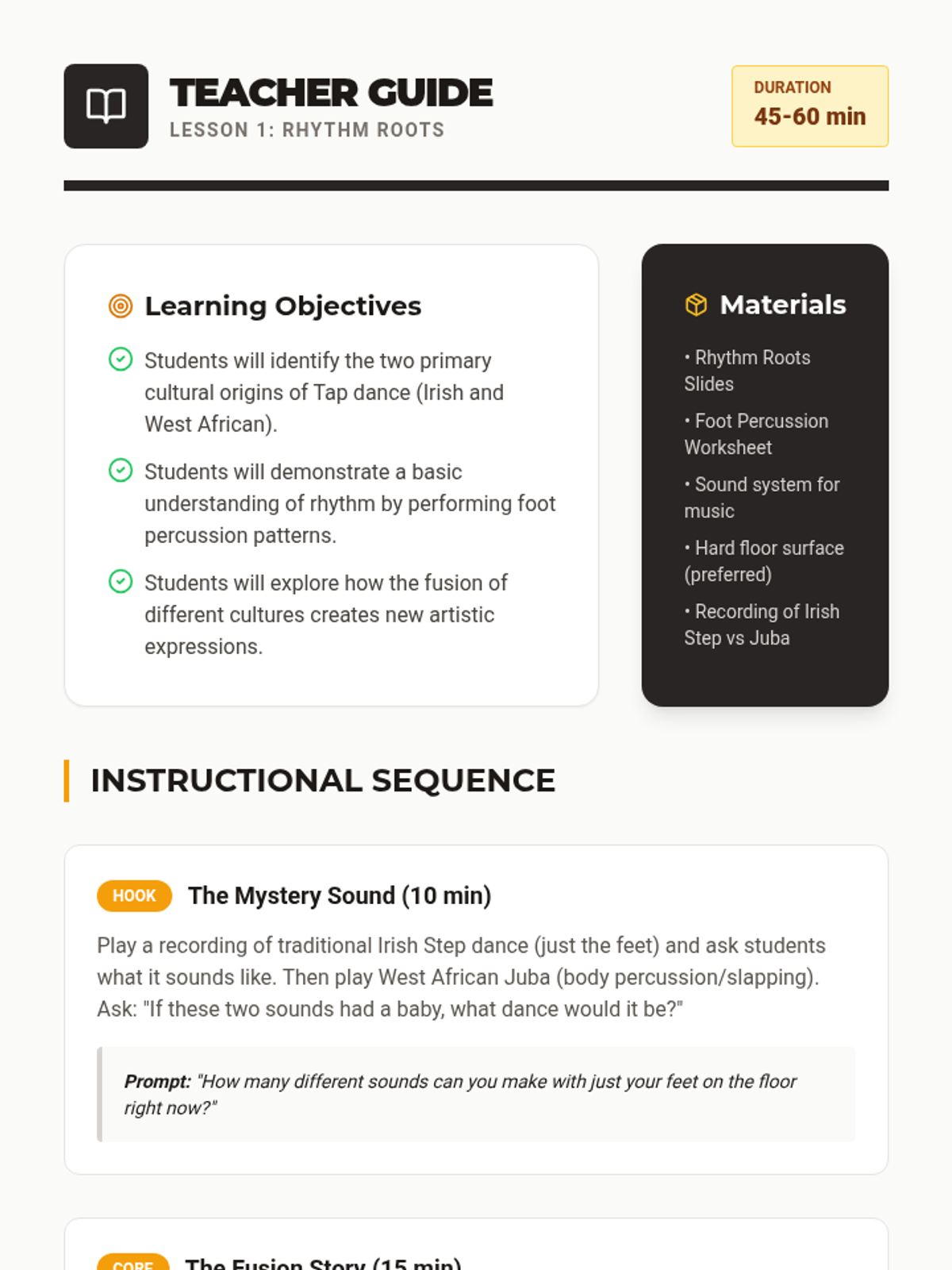 This sequence explores dance as a storytelling medium across cultures, focusing on gesture, rhythm, and costume to communicate history and myth without words. Students progress from basic pantomime to creating their own narrative choreographies based on cultural traditions.