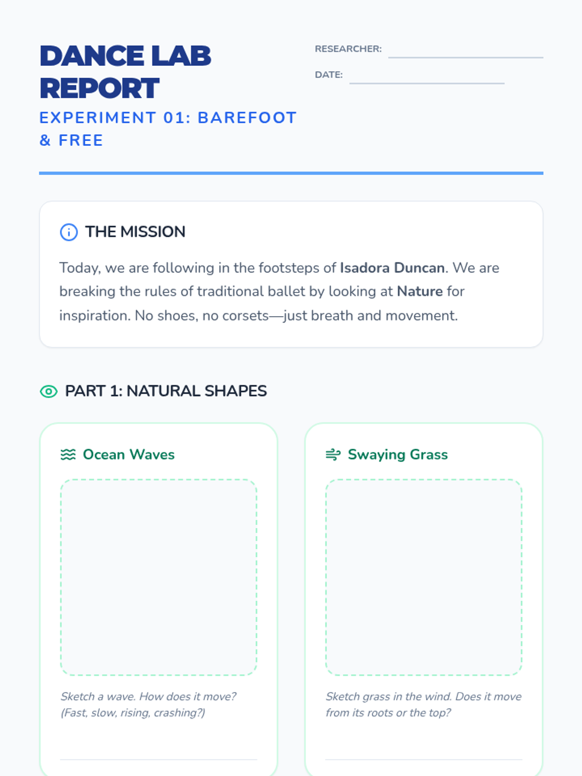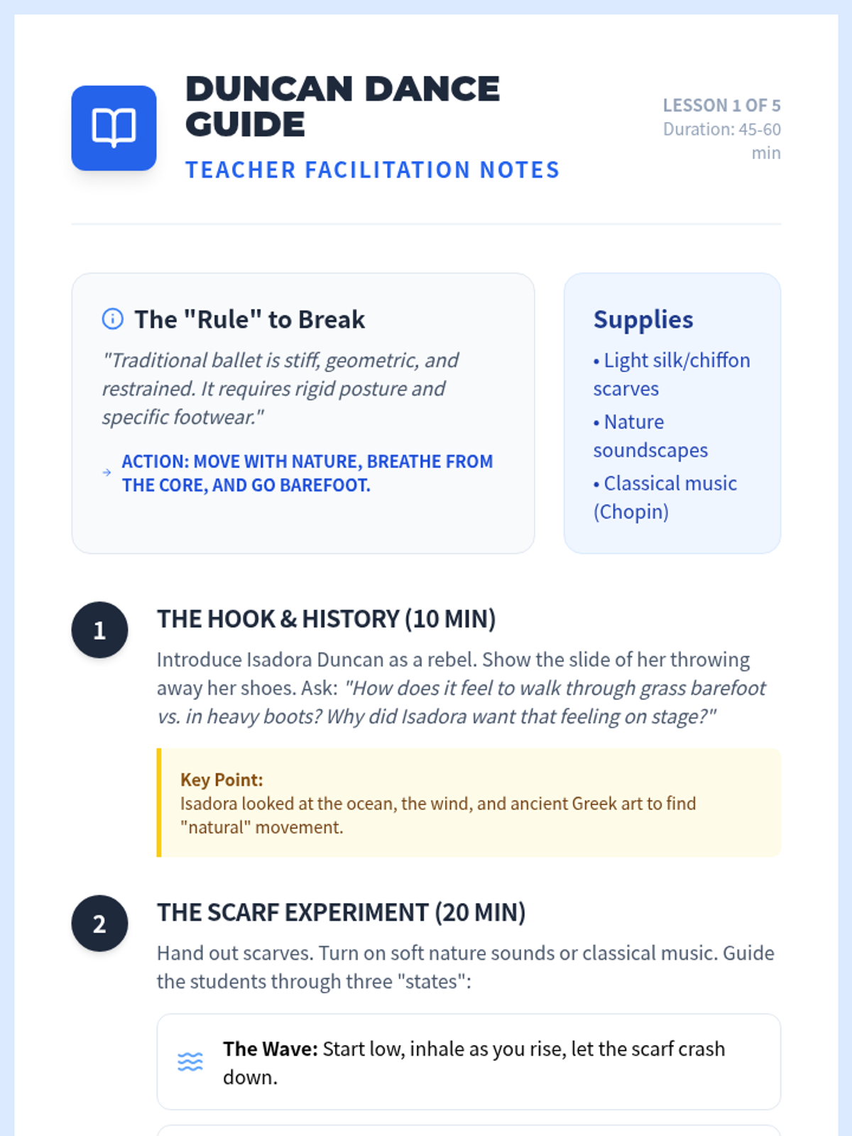 A 5-lesson unit for 3rd graders exploring the history of modern dance pioneers and using their 'rule-breaking' concepts to create original choreography. Students move from the naturalism of Duncan to the emotional core of Graham, the chance methods of Cunningham, and the soulful storytelling of Ailey.