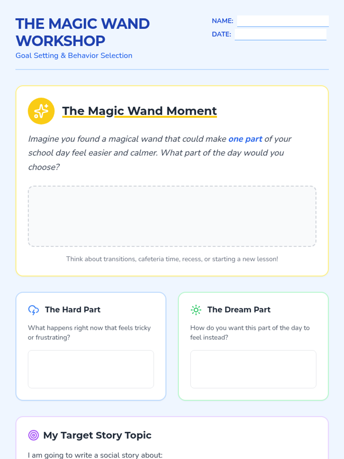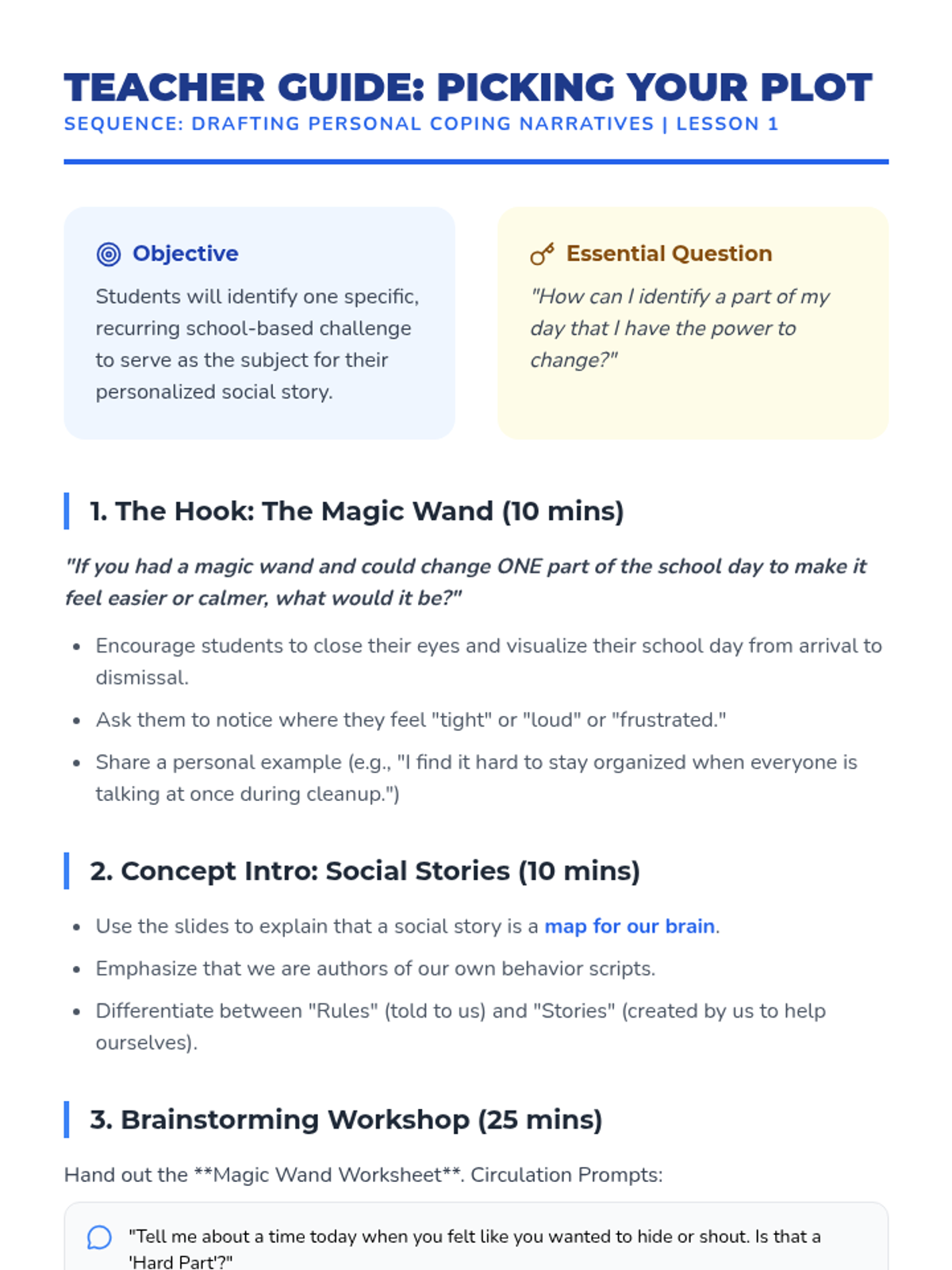 A 5-lesson project-based sequence where 3rd-grade students learn to identify challenging school moments, draft first-person positive narratives, and integrate visual cues to create their own personalized social stories for coping and transition.